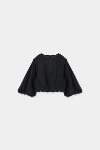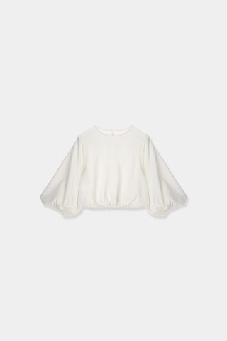 ポリエステルのスラブ糸を使用し、リネンのスラブ・ネップ感を再現した麻調合素材を用いることで、甘くなりがちなパフスリーブデザインもカジュアルでリラックスムード漂う大人な印象に。