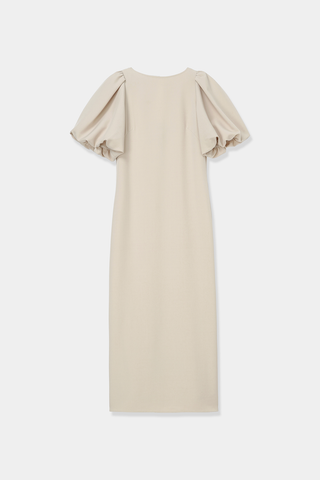 立体的なパフスリーブと直線的なラインのコントラストが印象的な、ペンシルドレス。