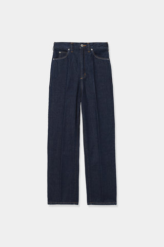 コントラストの効いた配色ステッチと、センタープレスが印象的なストレートデニム。