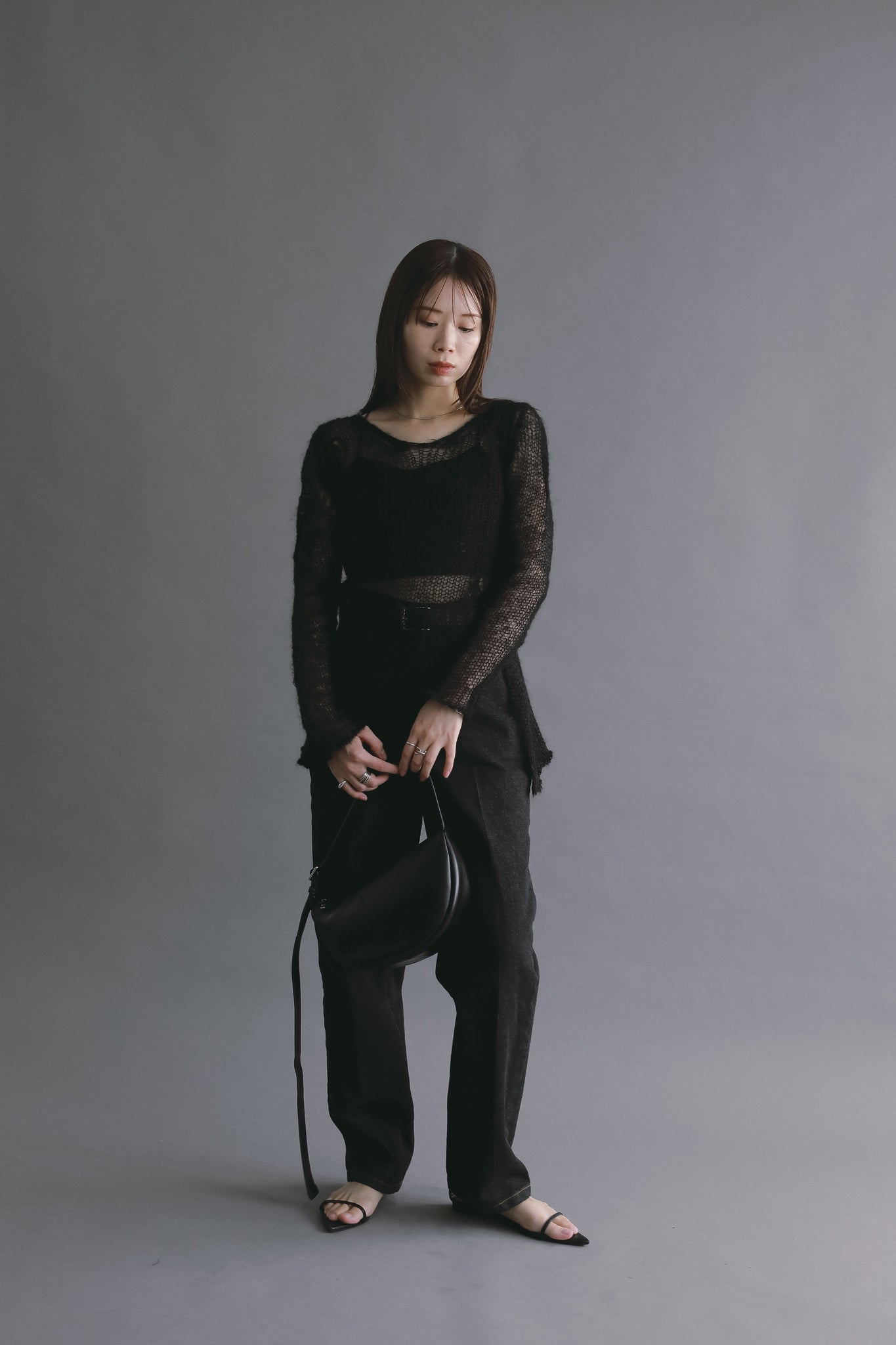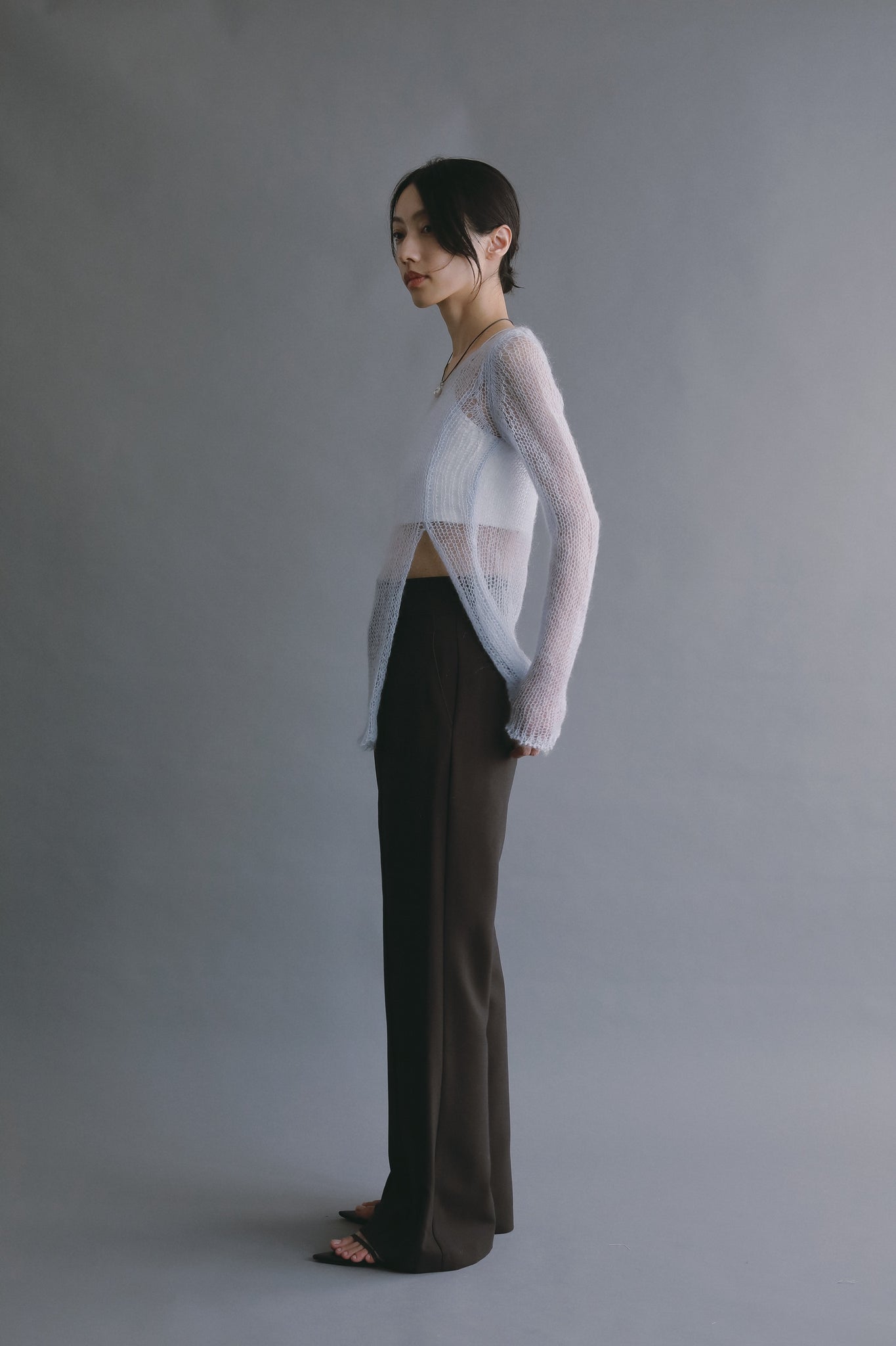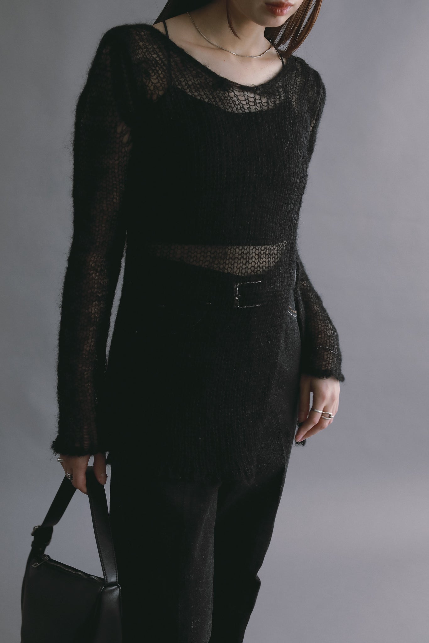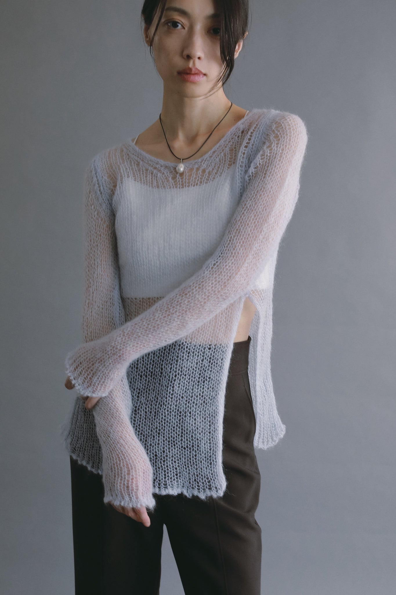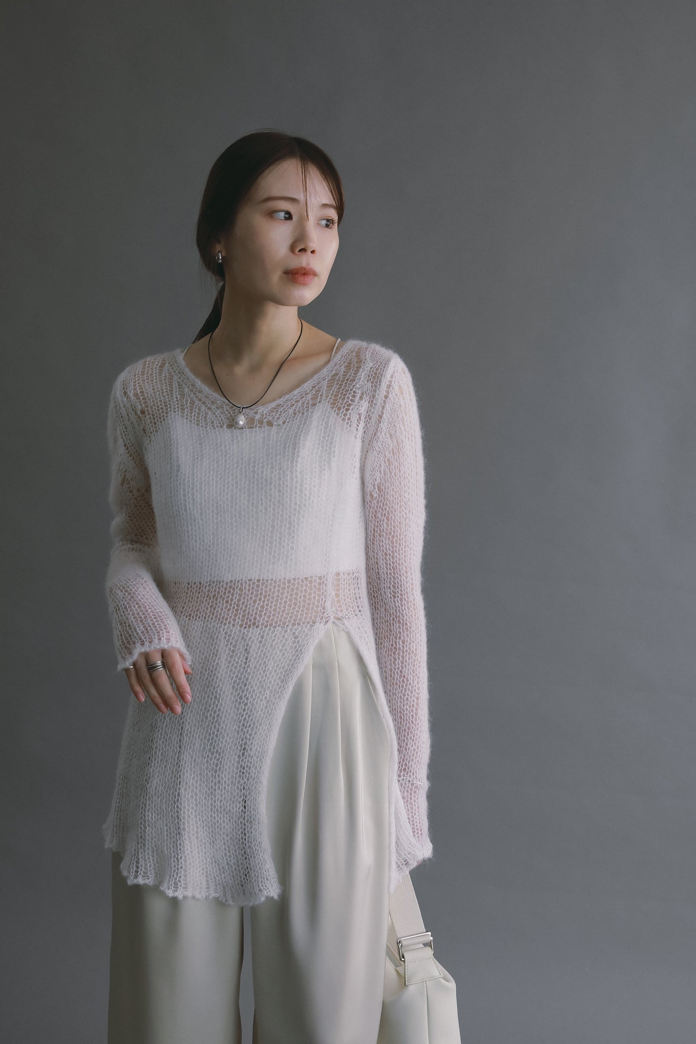 透け感を活かしたスタイリングが、このニットならではの魅力です。