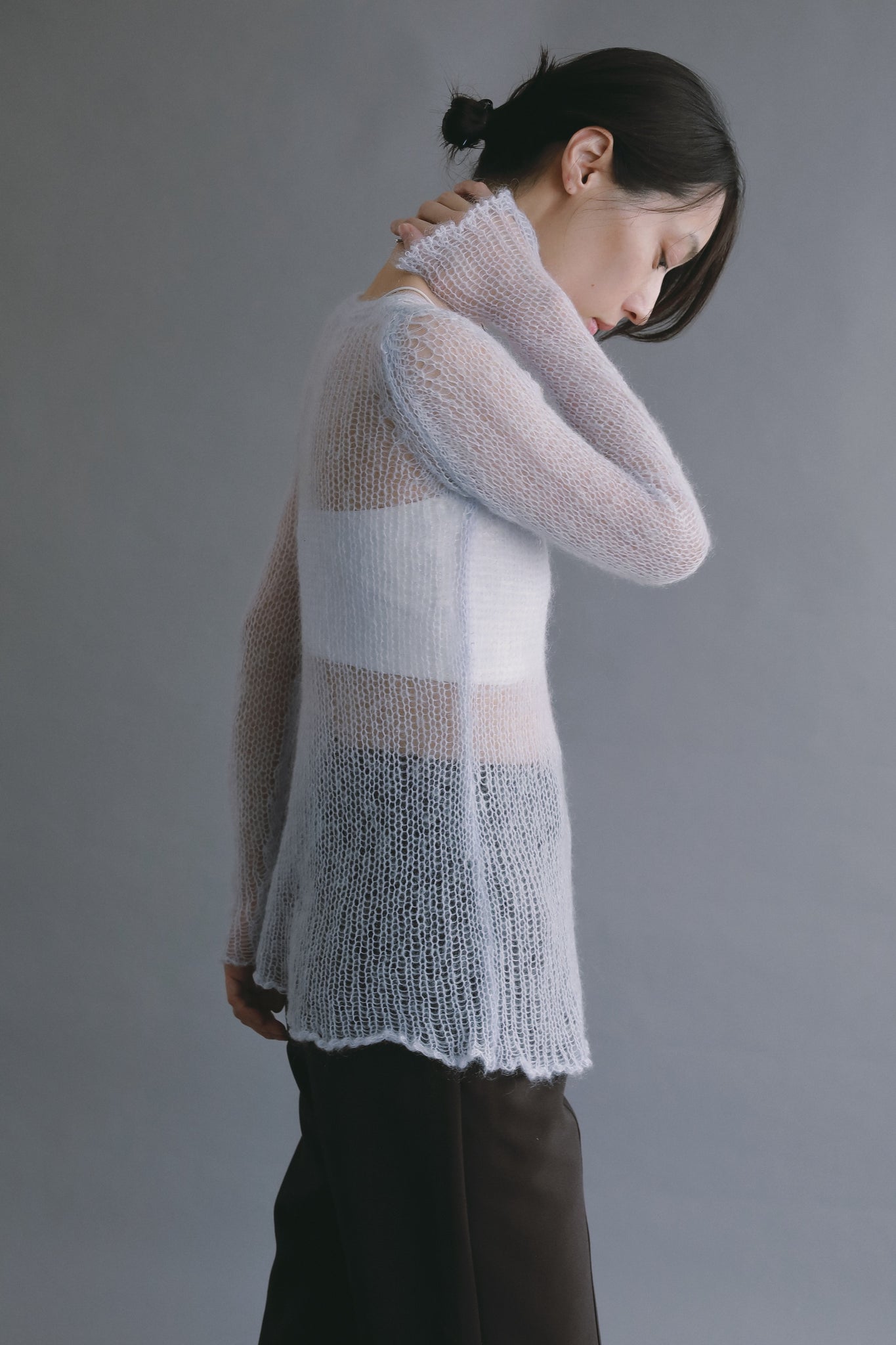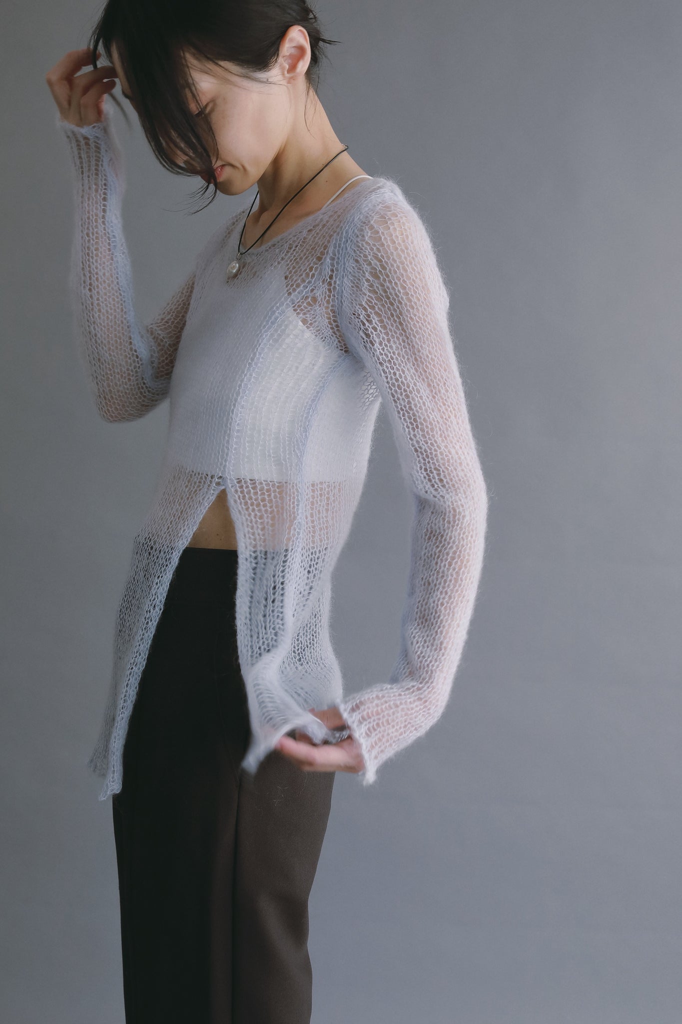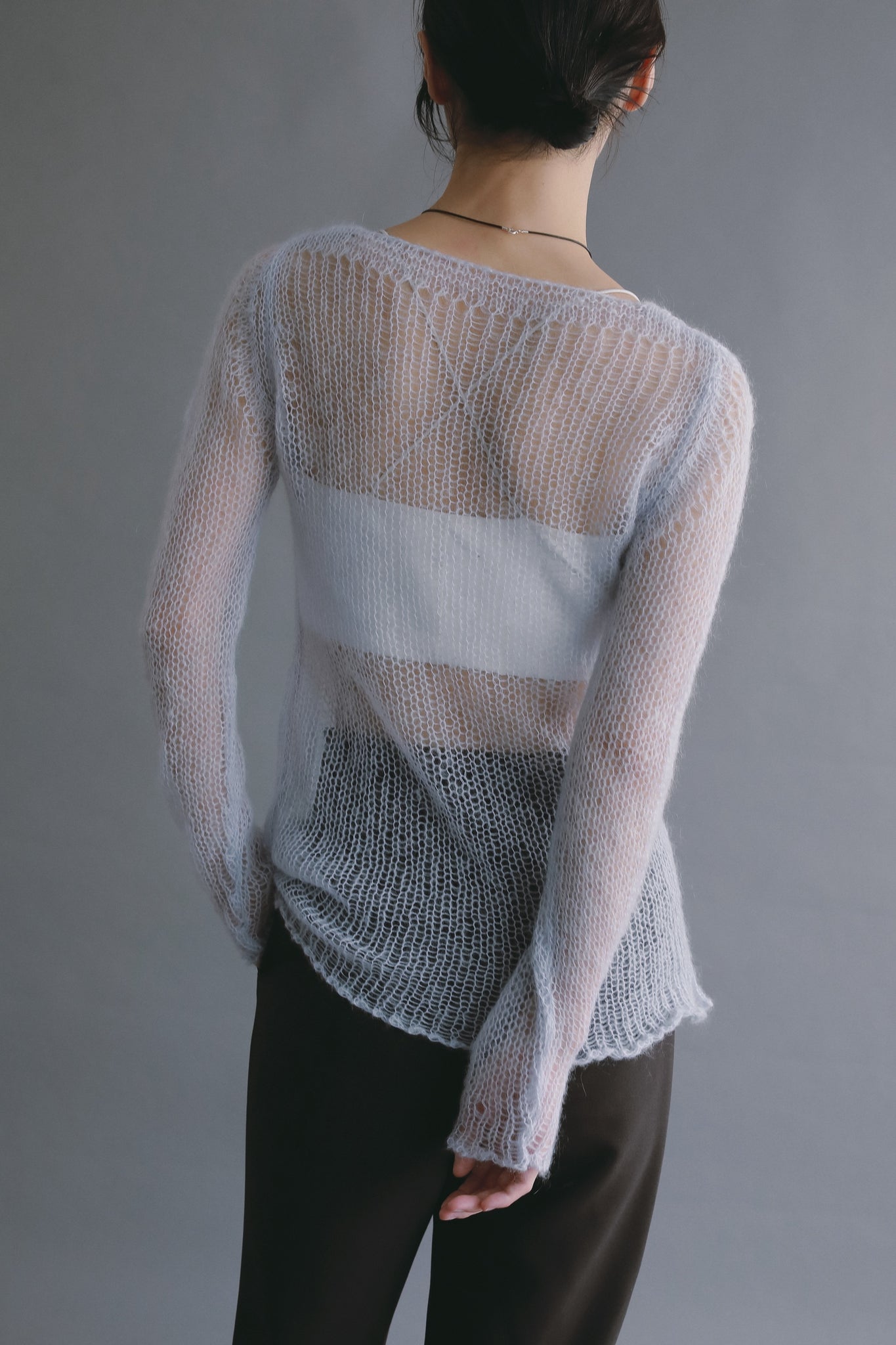 繊細な透け感と軽やかな風合いが印象的な、モヘアニットプルオーバー。
