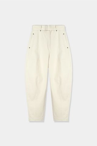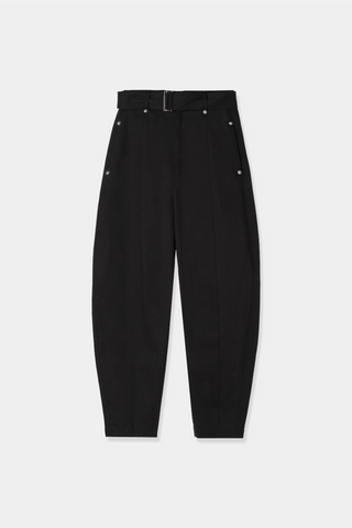 構築的なパターンのフォルムが特徴的なベルトパンツ。