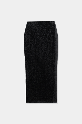 光を受けて表情を変えるスパンコールのテクスチャが特徴的なスカート。