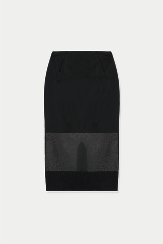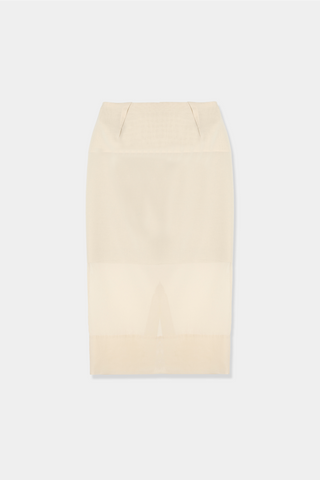 ミディ丈でレディな印象を与えつつも、ローウエスト設定やあえて膝下から裏地をなくすことで大人っぽさを演出。