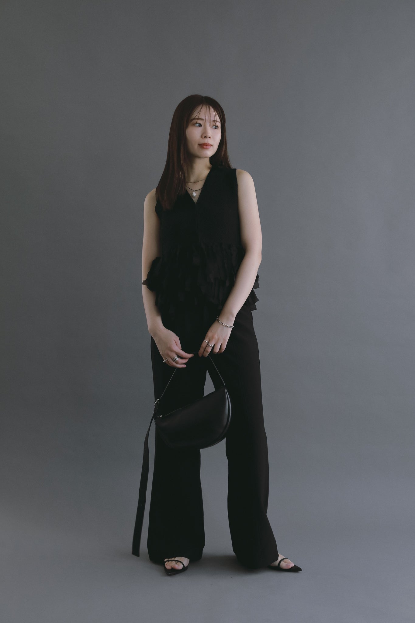 ウエストまわりはコンパクトに整え、トップスをインした際ももたつかない印象に。