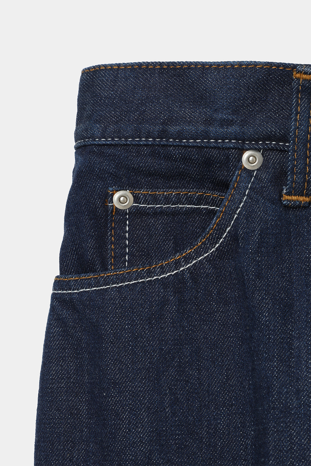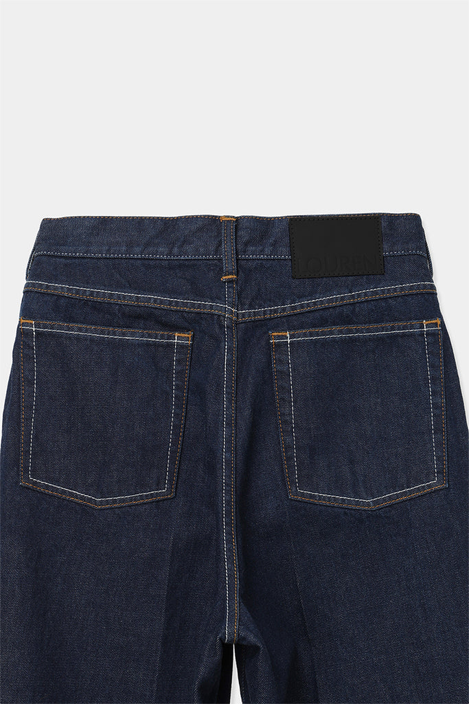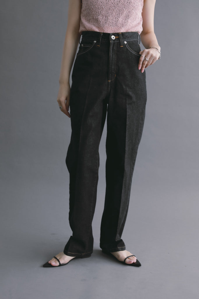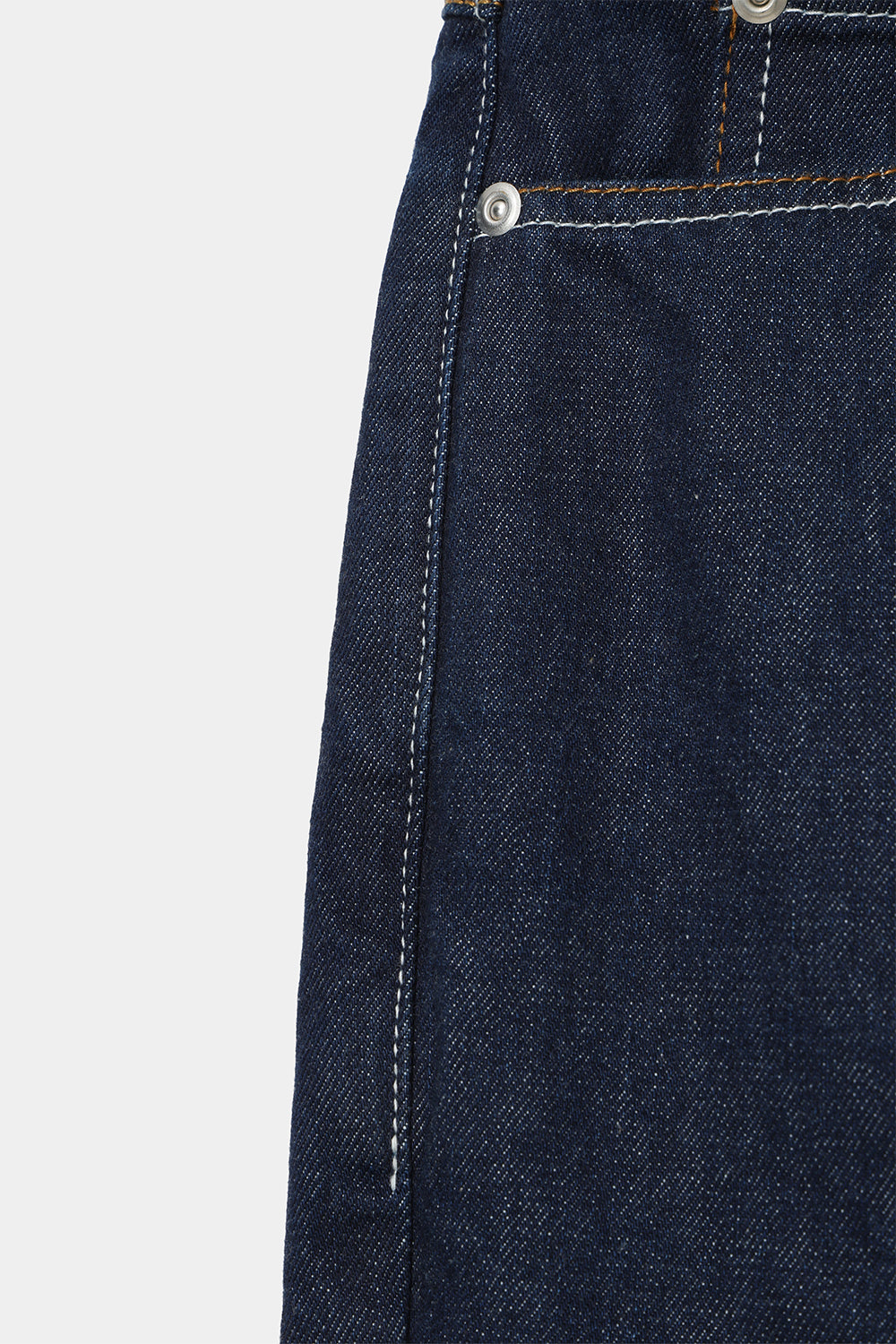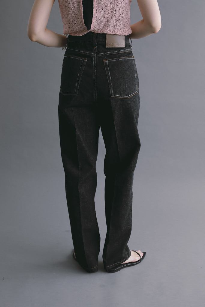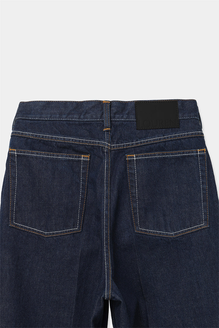 コントラストの効いた配色ステッチと、センタープレスが印象的なストレートデニム。