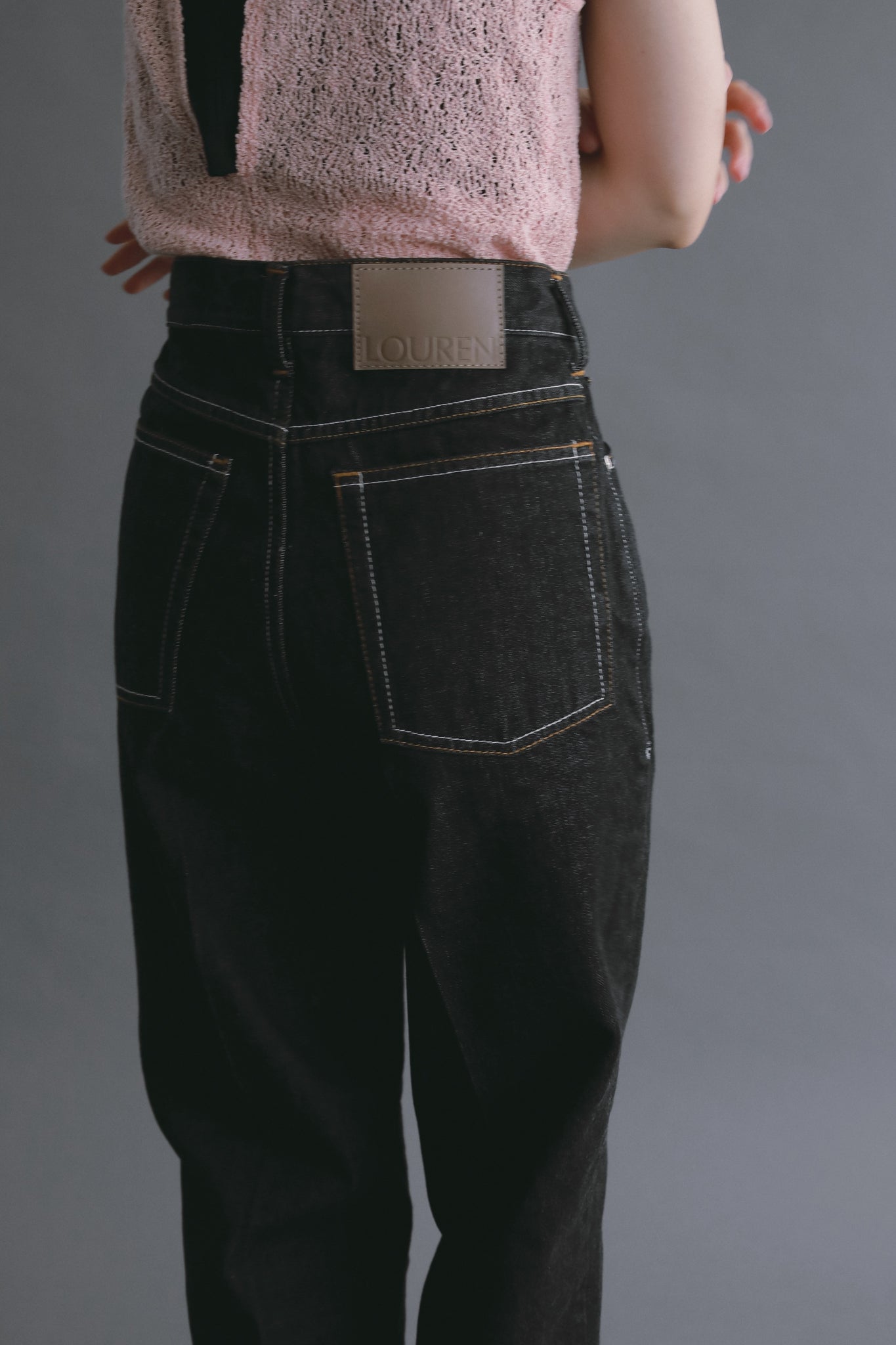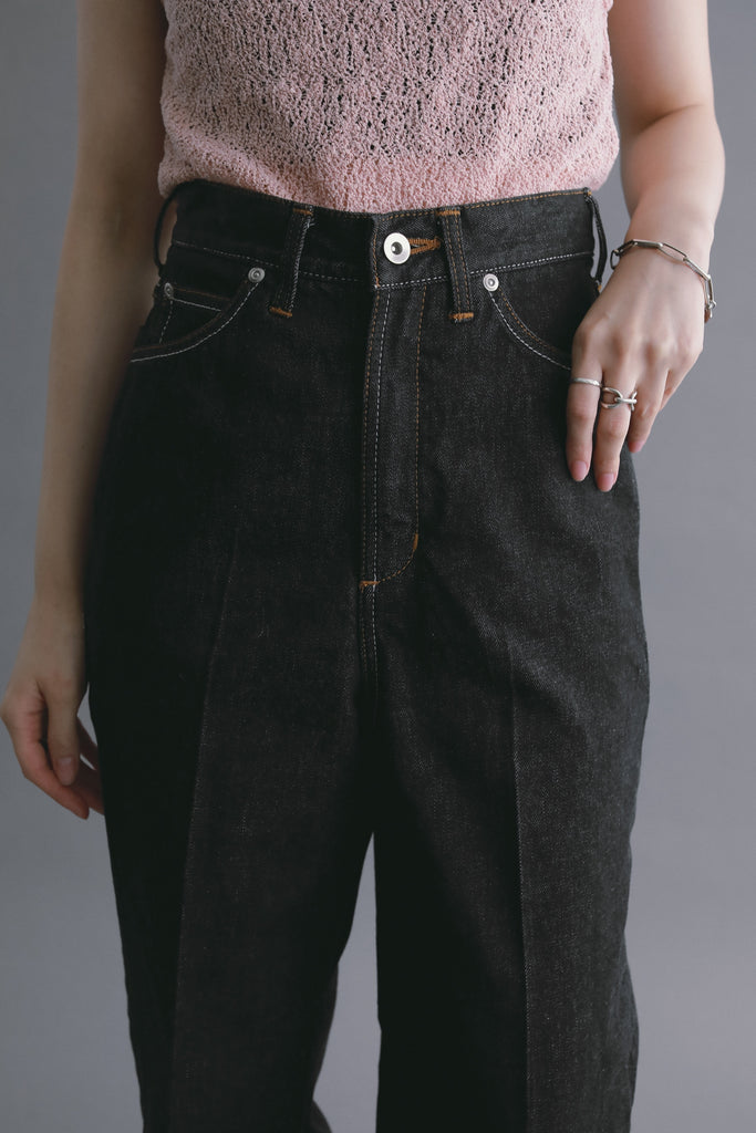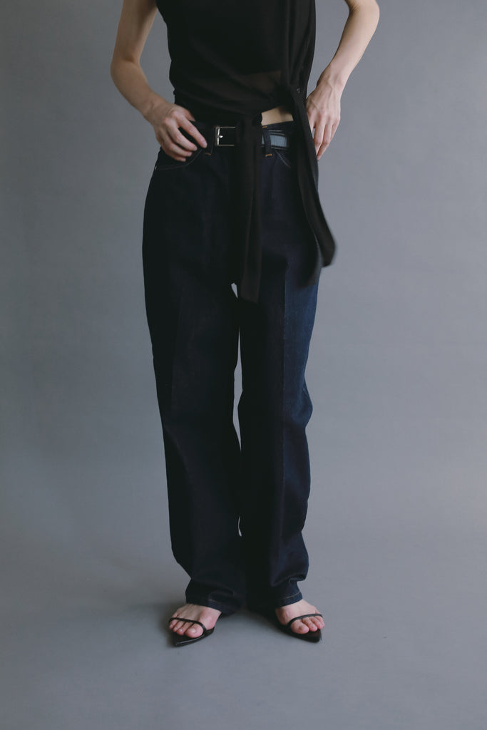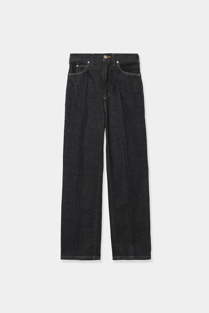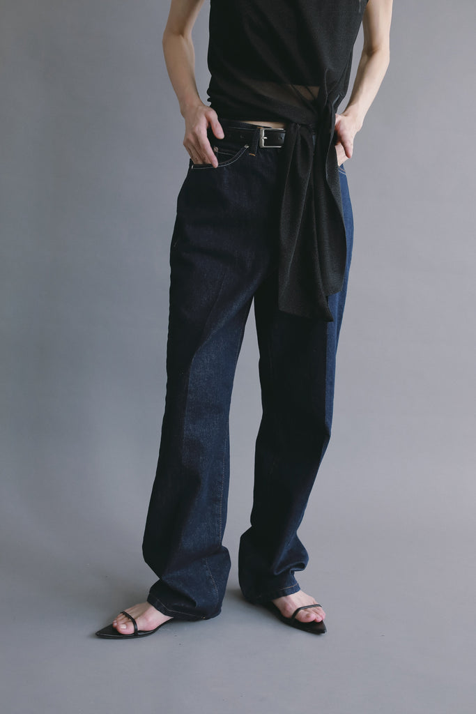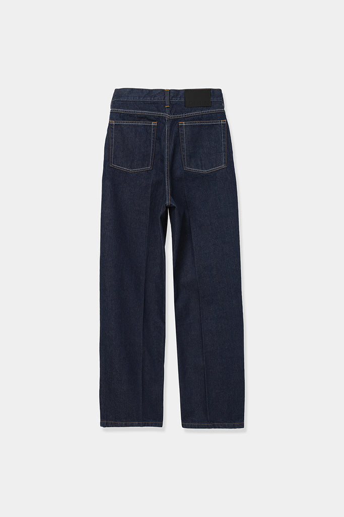 コントラストの効いた配色ステッチと、センタープレスが印象的なストレートデニム。