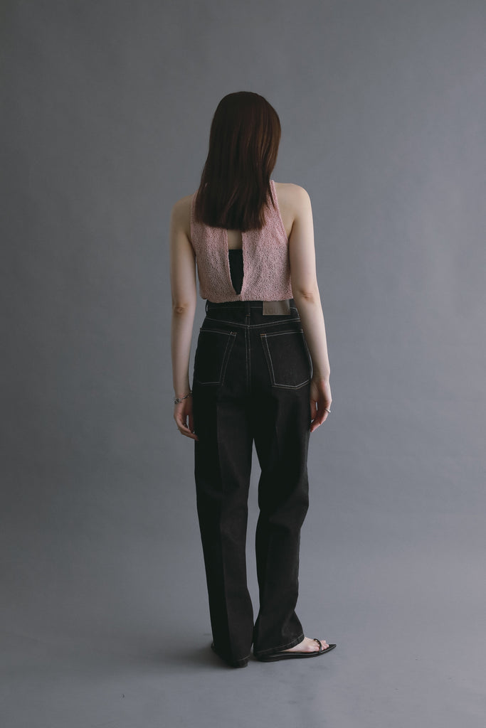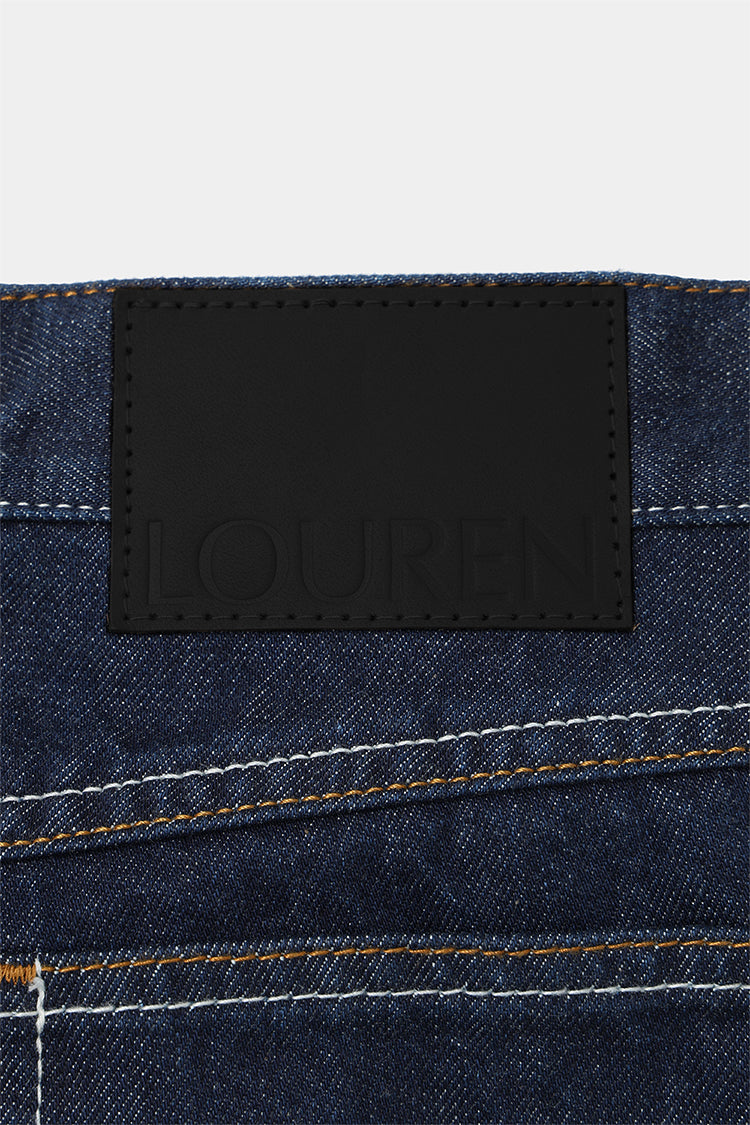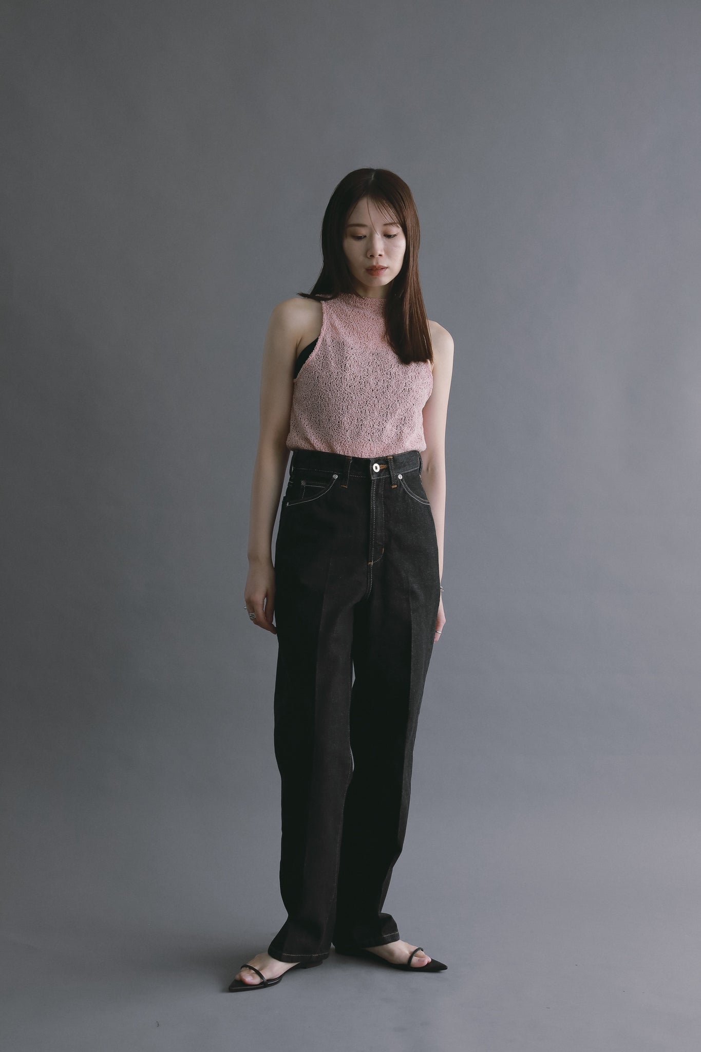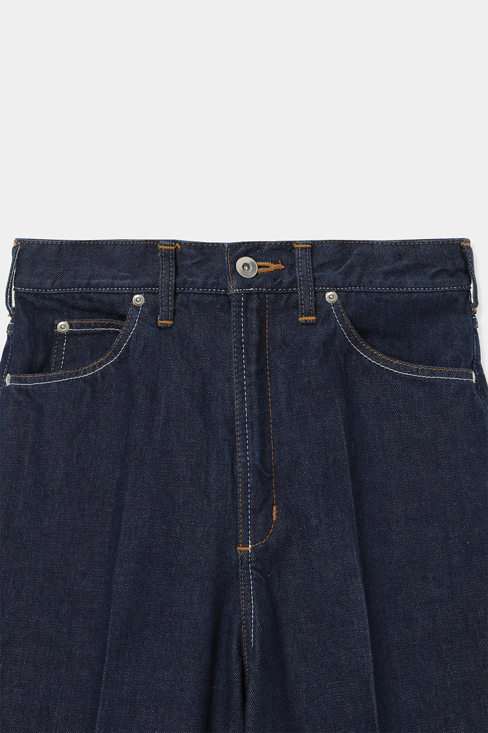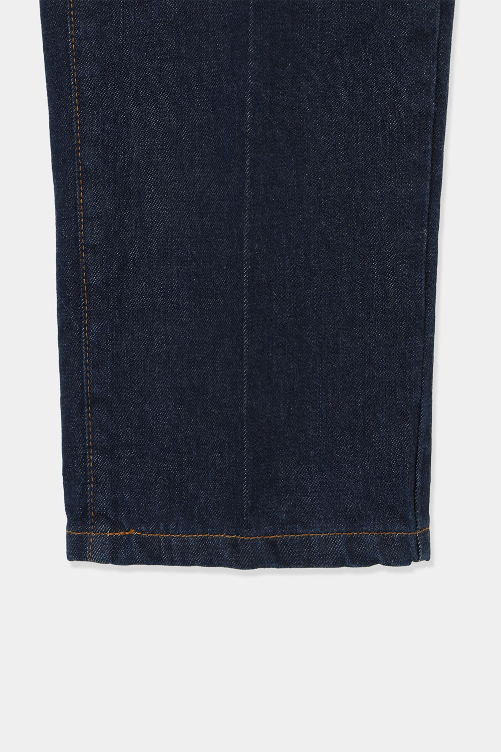 コントラストの効いた配色ステッチと、センタープレスが印象的なストレートデニム。