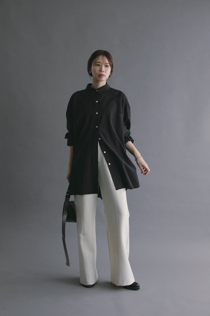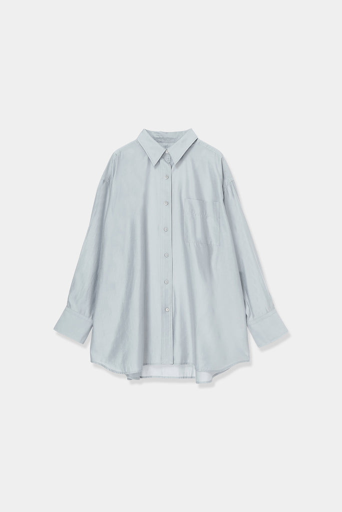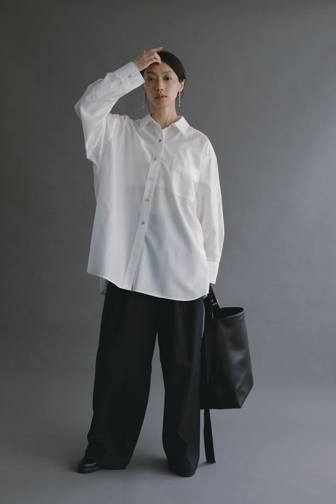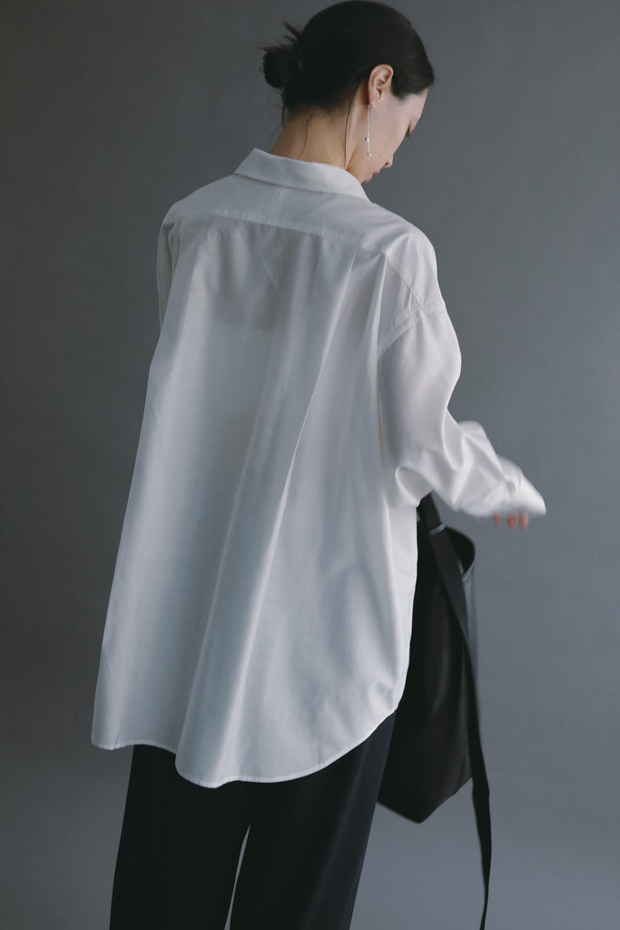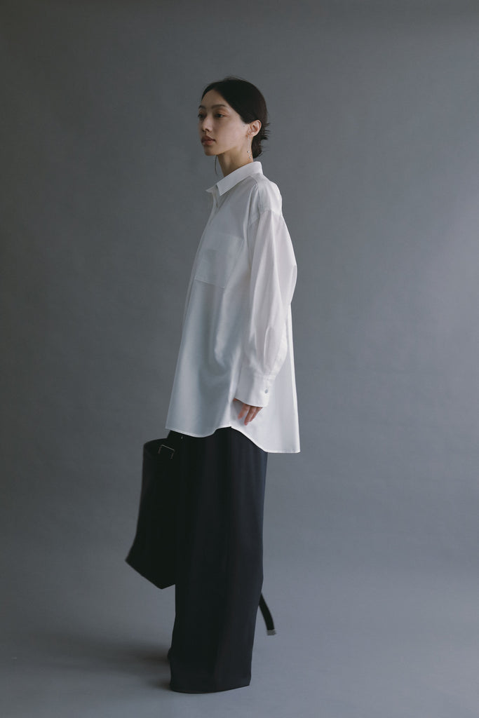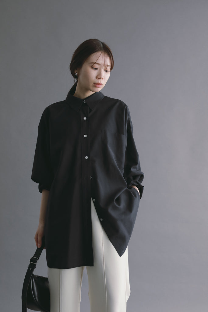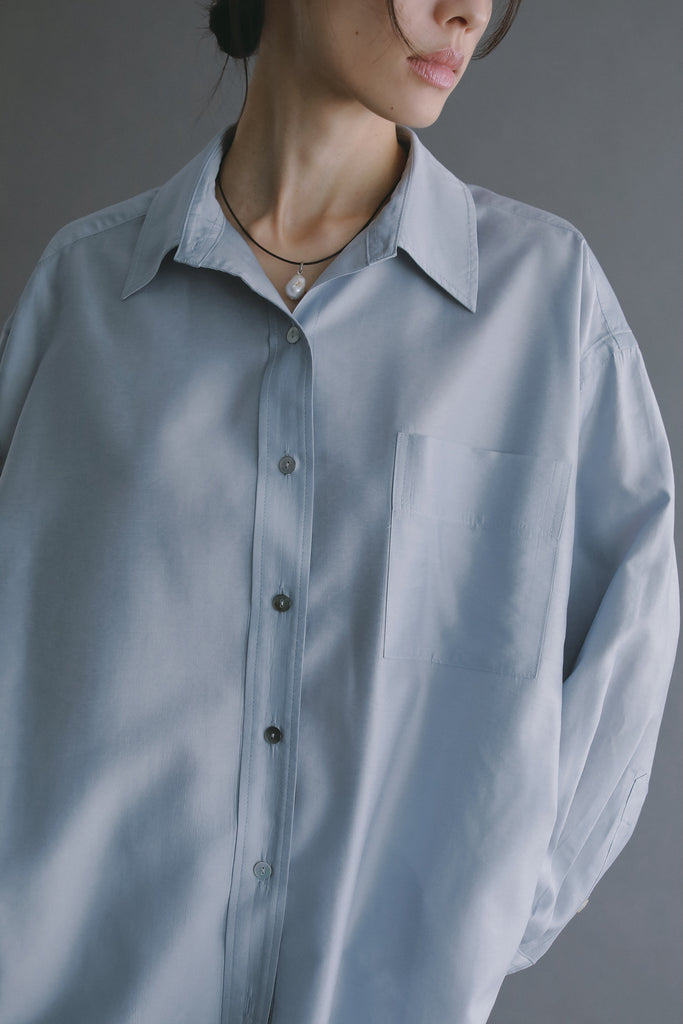 なめらかな落ち感と、ほのかな光沢を感じさせる素材を使用したオーバーサイズシャツ。