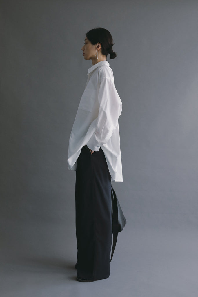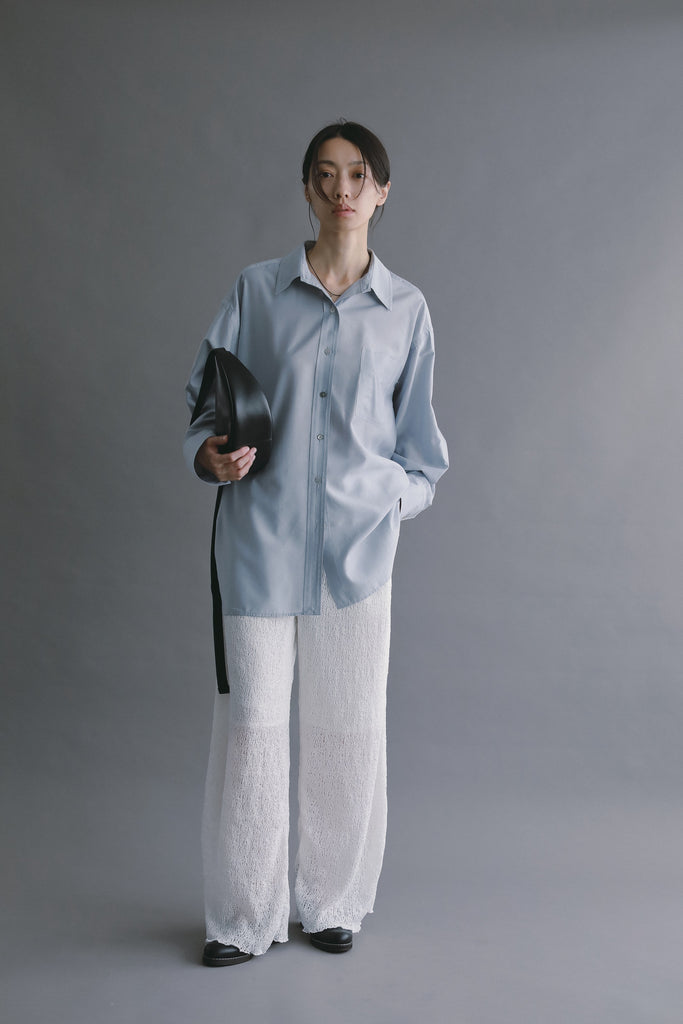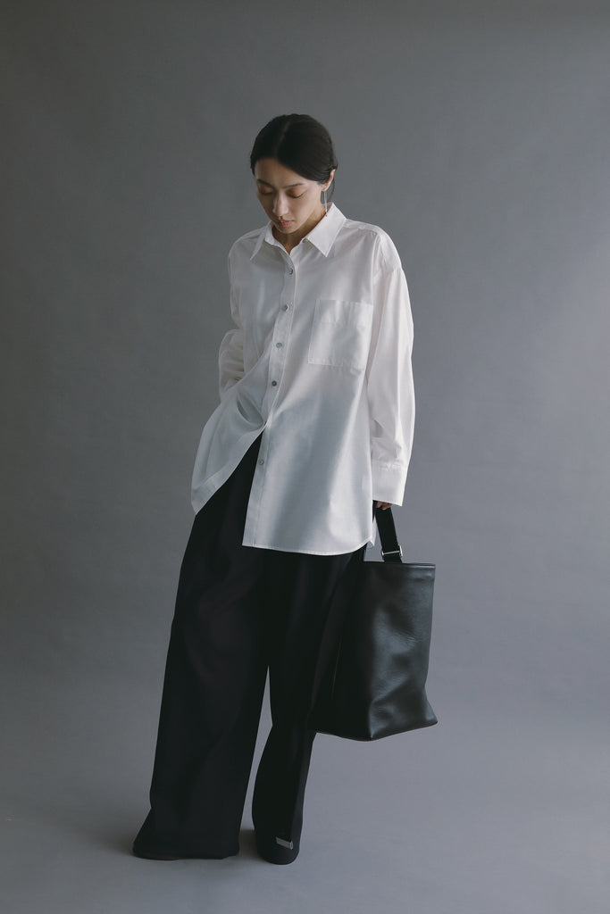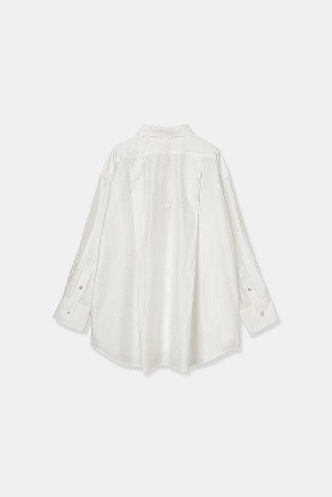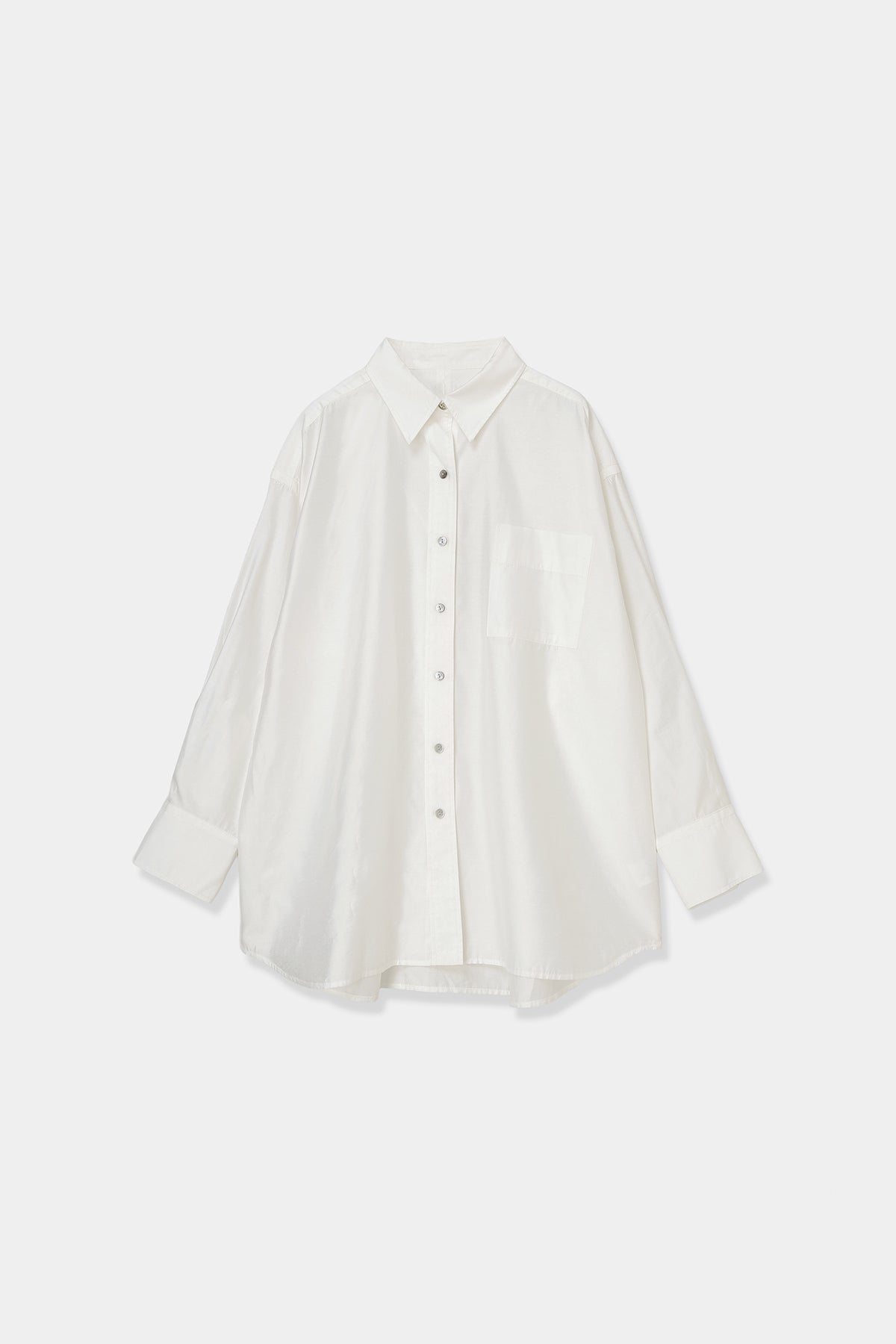 なめらかな落ち感と、ほのかな光沢を感じさせる素材を使用したオーバーサイズシャツ。