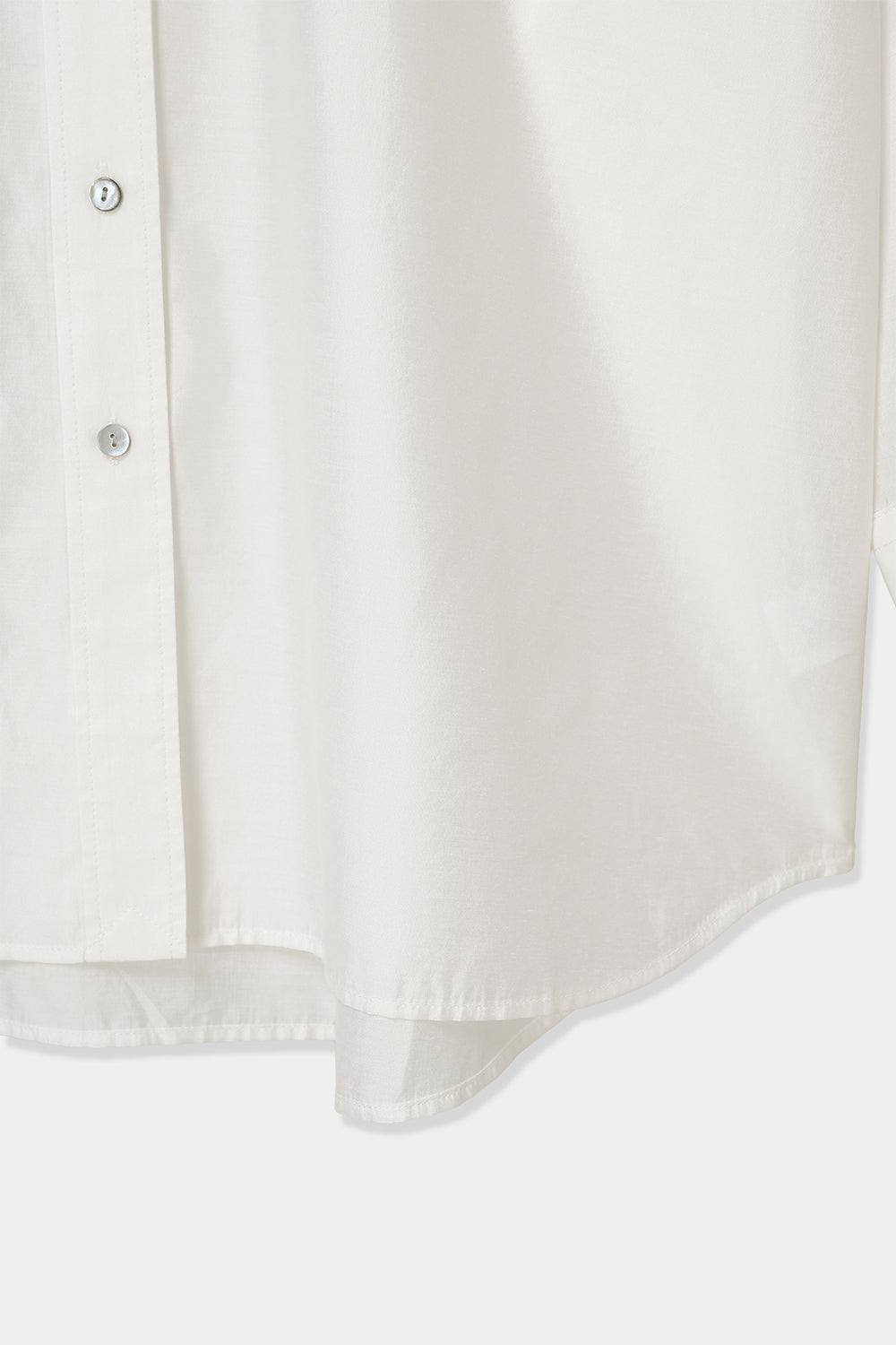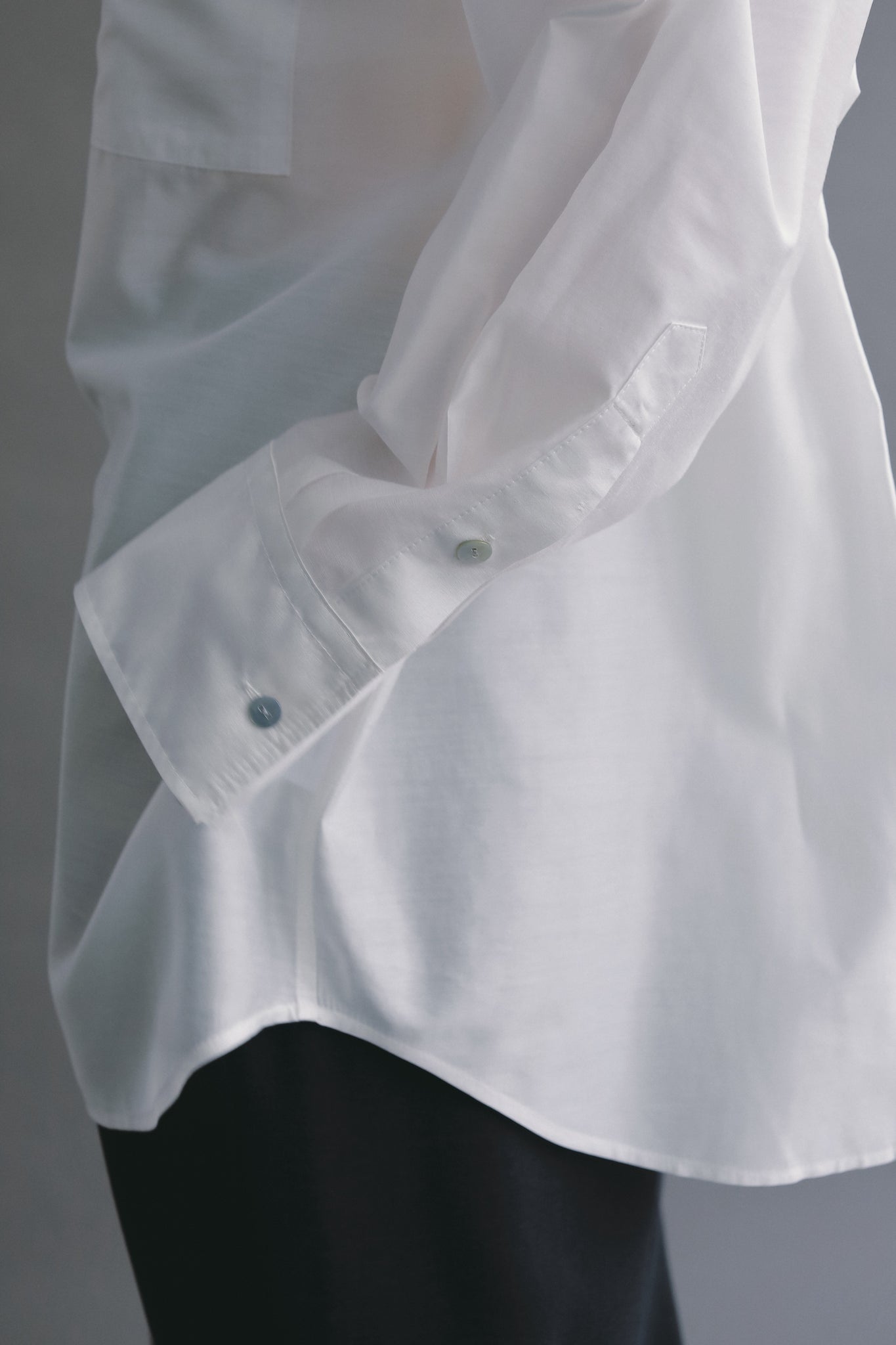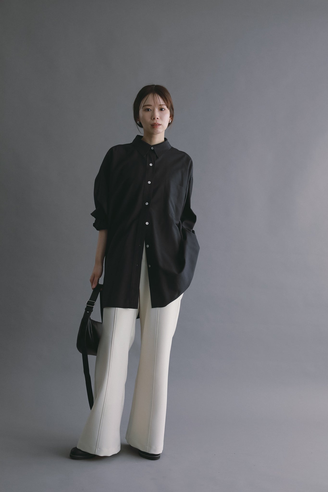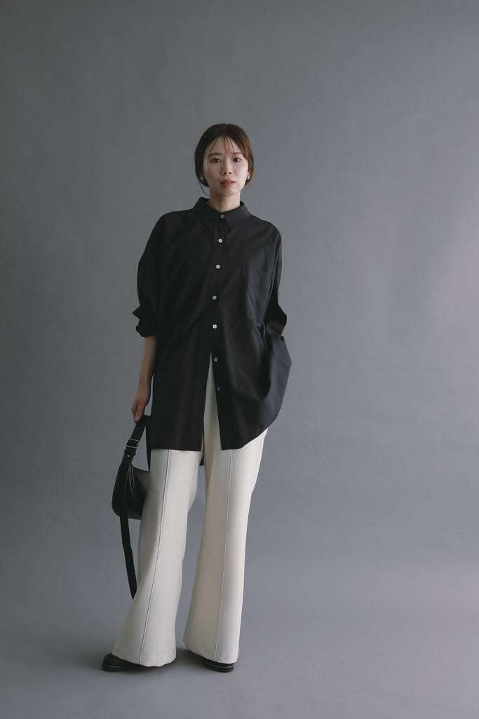 身体のラインを拾いすぎず、前後差のある着丈とラウンドヘムが軽さをプラス。
