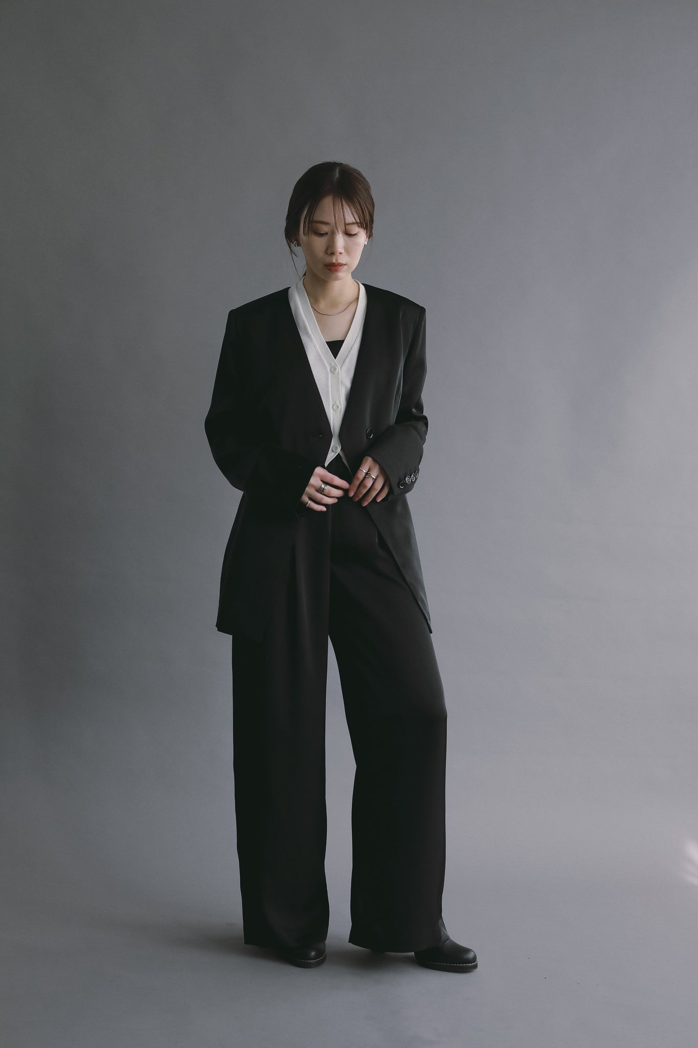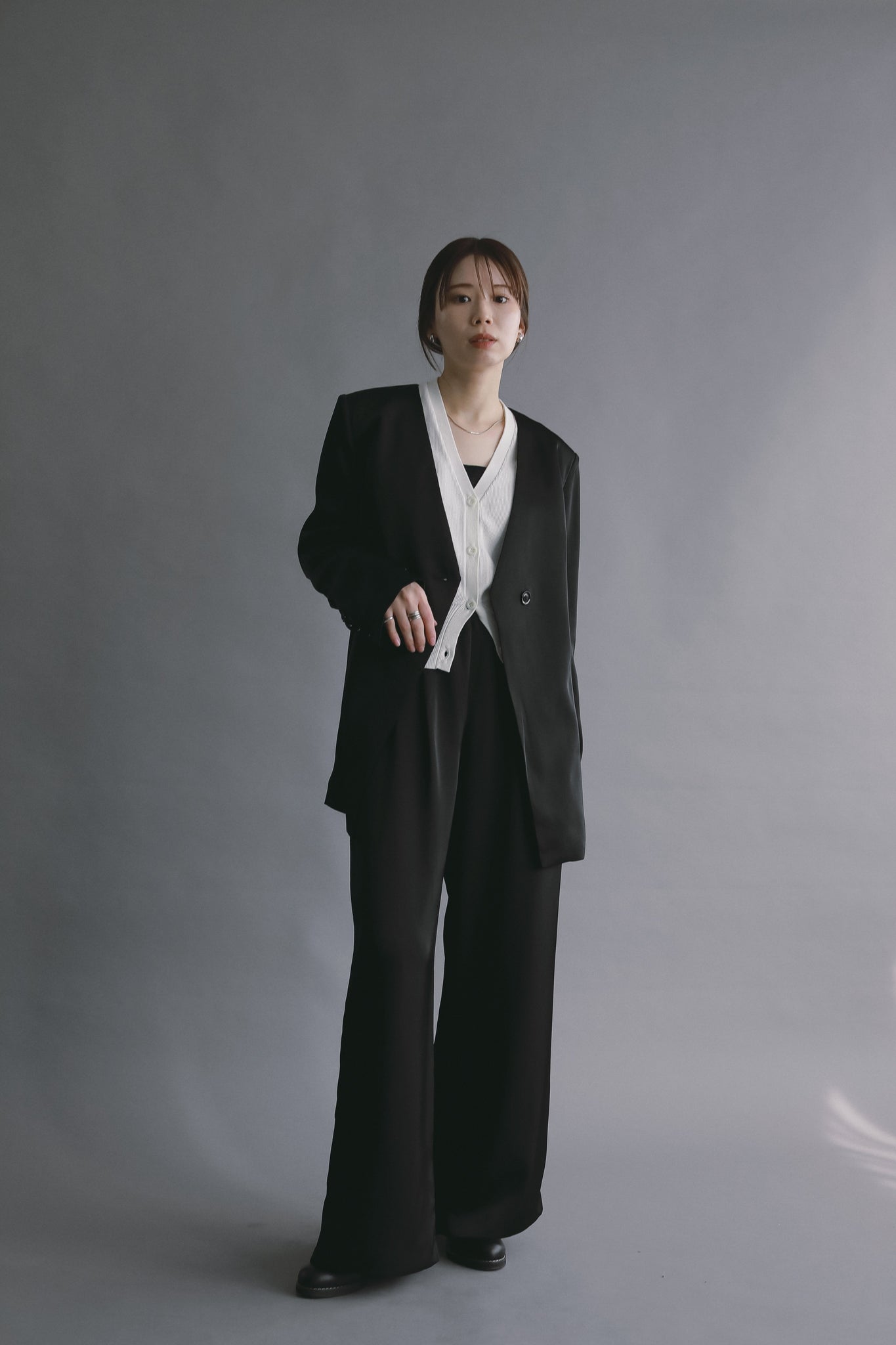 控えめな光沢感がスタイリングに奥行きを与え、シンプルながらも洗練された印象に仕上げています。