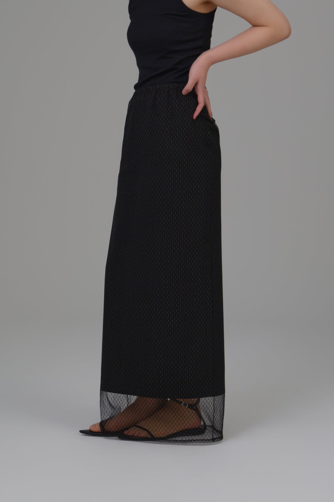 オーロラのように光の角度によって複雑に色が変化するラメレースを用いた華やかなスカート。