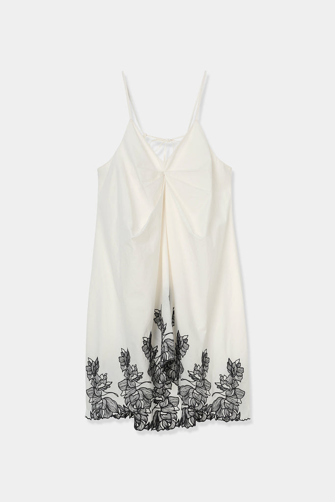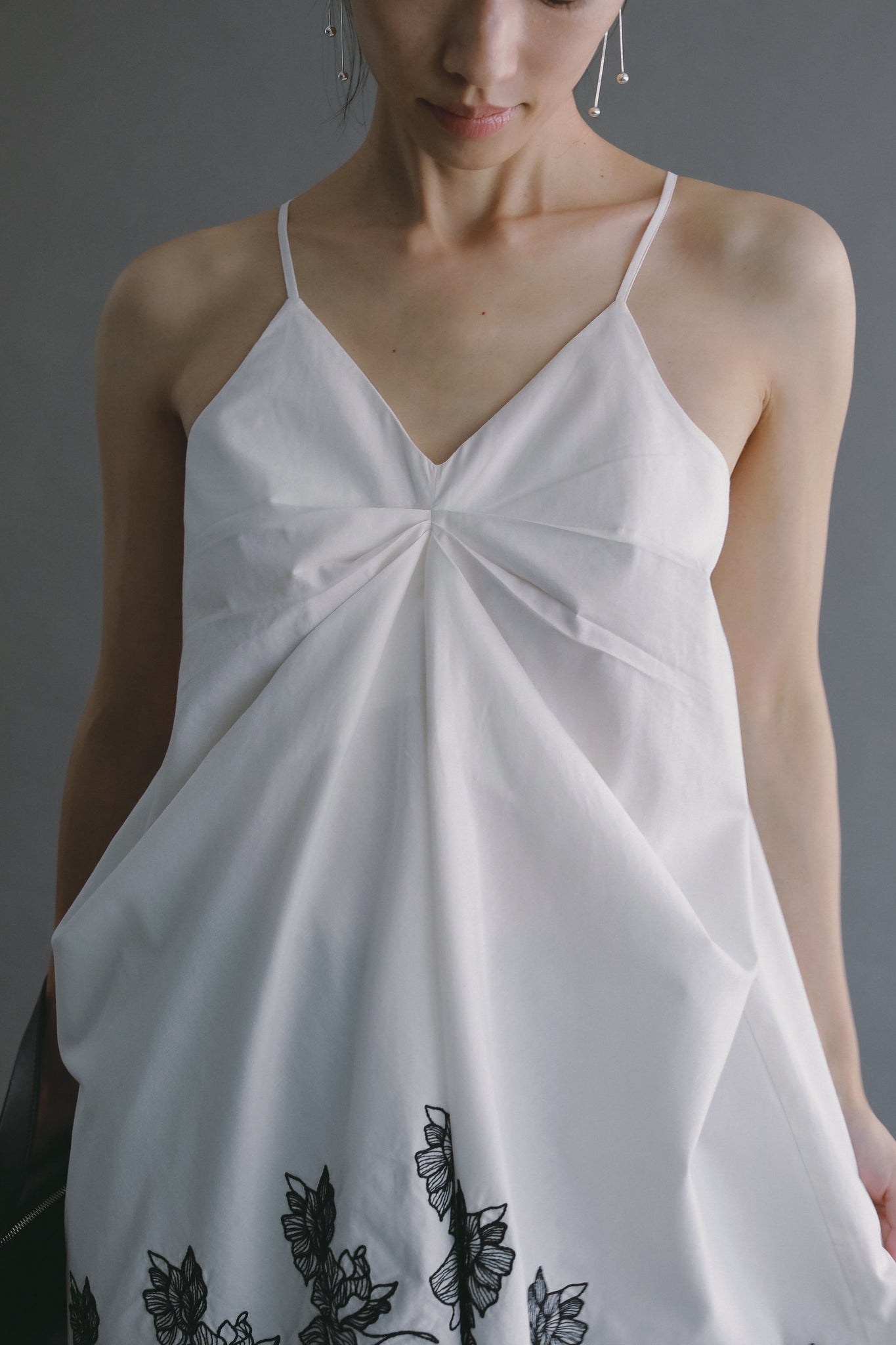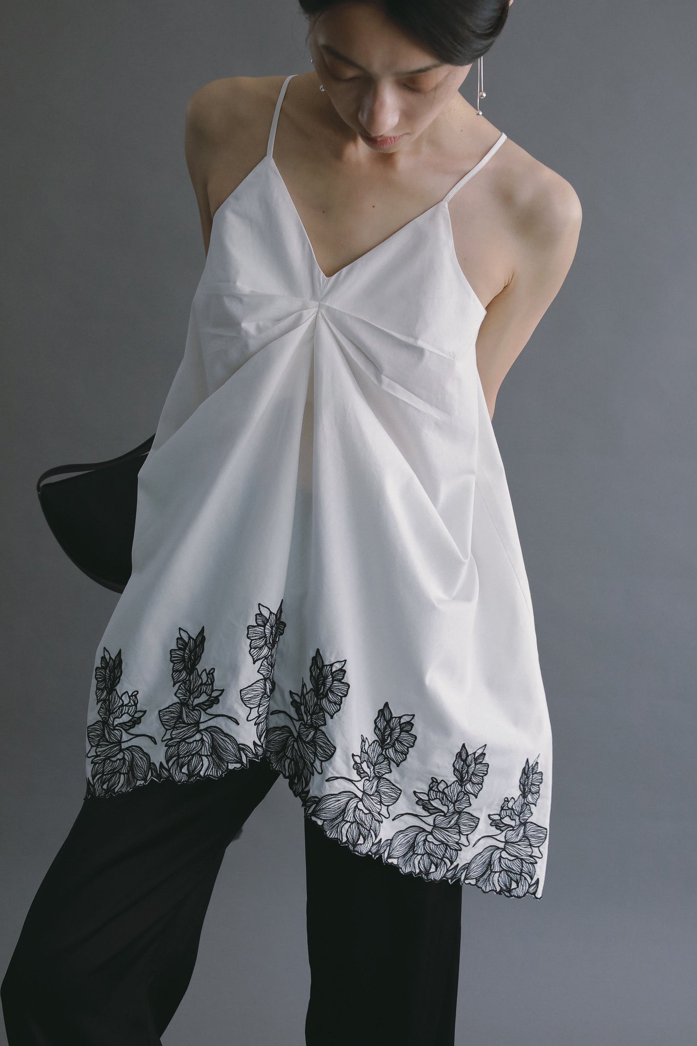 裾にフラワーモチーフの刺繍をあしらった、存在感のあるキャミソールトップス。