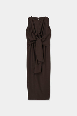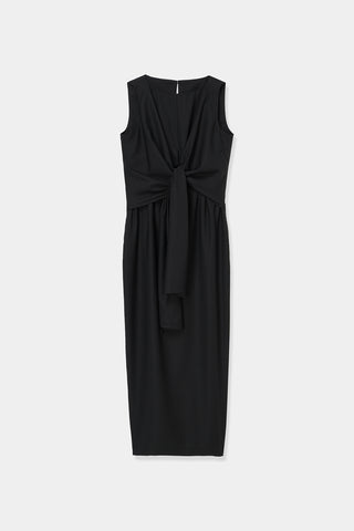 ウエスト部分で結ばれた大きなタイが自然なドレープを生み出し、シンプルながらも視線を惹きつける一着です。