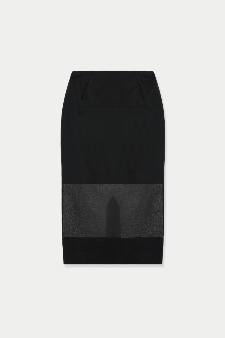 ミディ丈でレディな印象を与えつつも、ローウエスト設定やあえて膝下から裏地をなくすことで大人っぽさを演出。