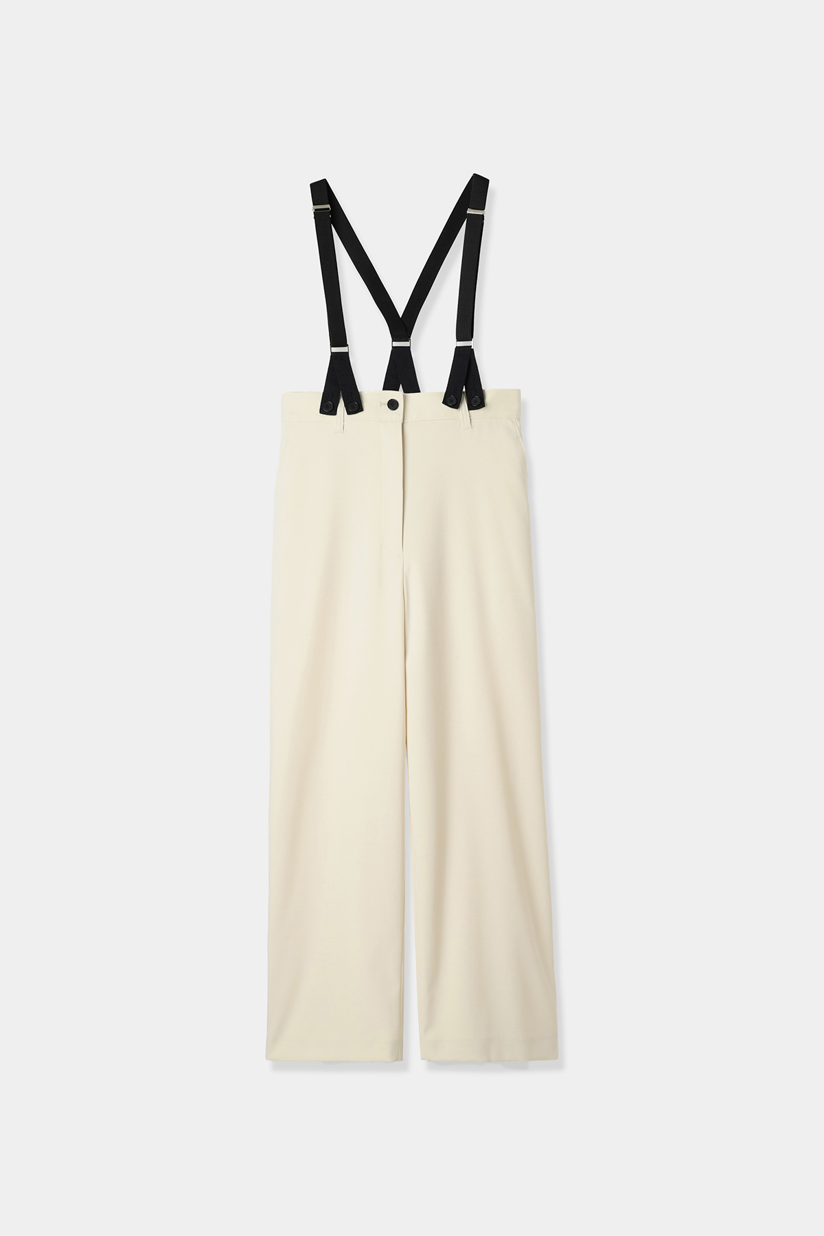 クラシックなデザインのサスペンダー付きワイドパンツ。