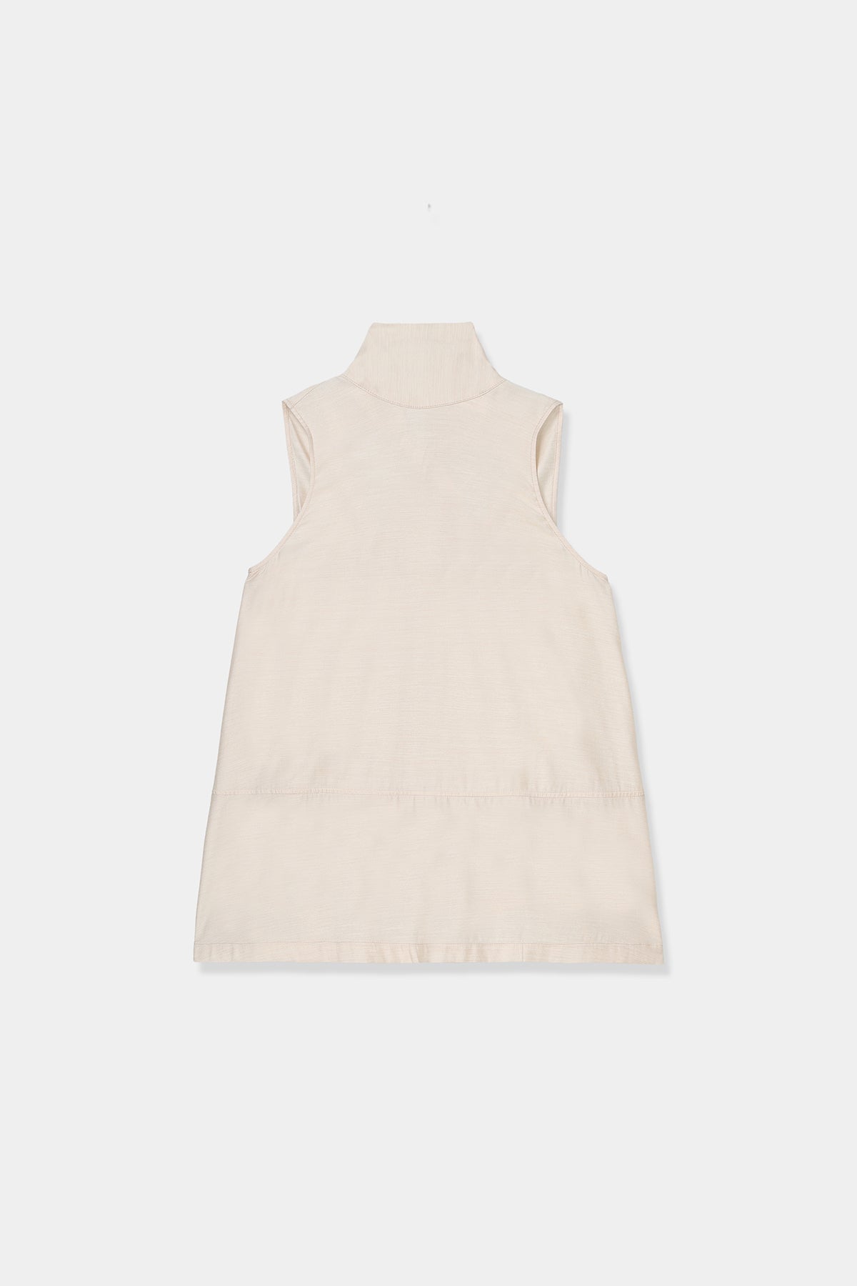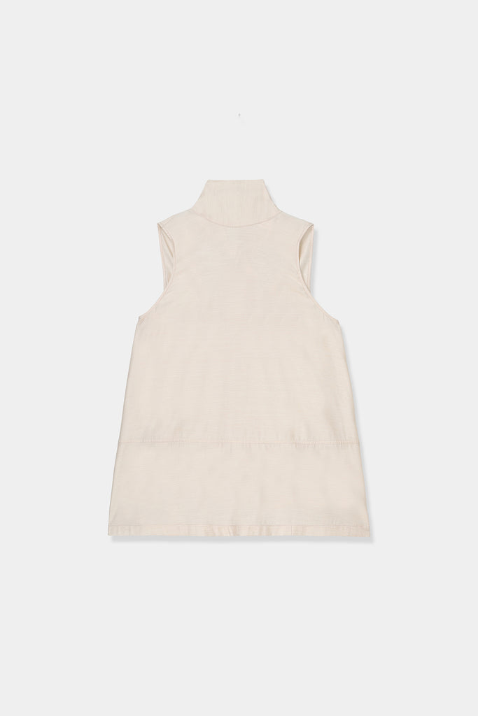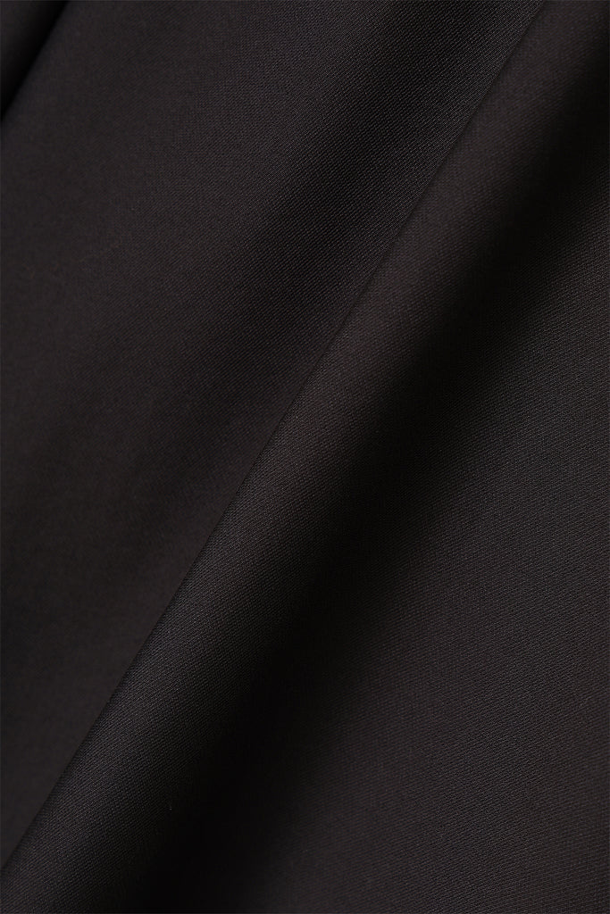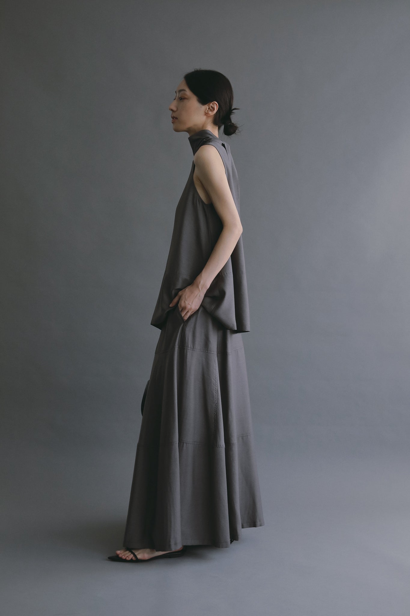 高めのネックラインからすっと落ちる直線的なシルエットは、品よく洗練された印象に。背面に施されたリボンは揺れるたびに女性らしさを演出し、後ろ姿にもアクセントを与えます。