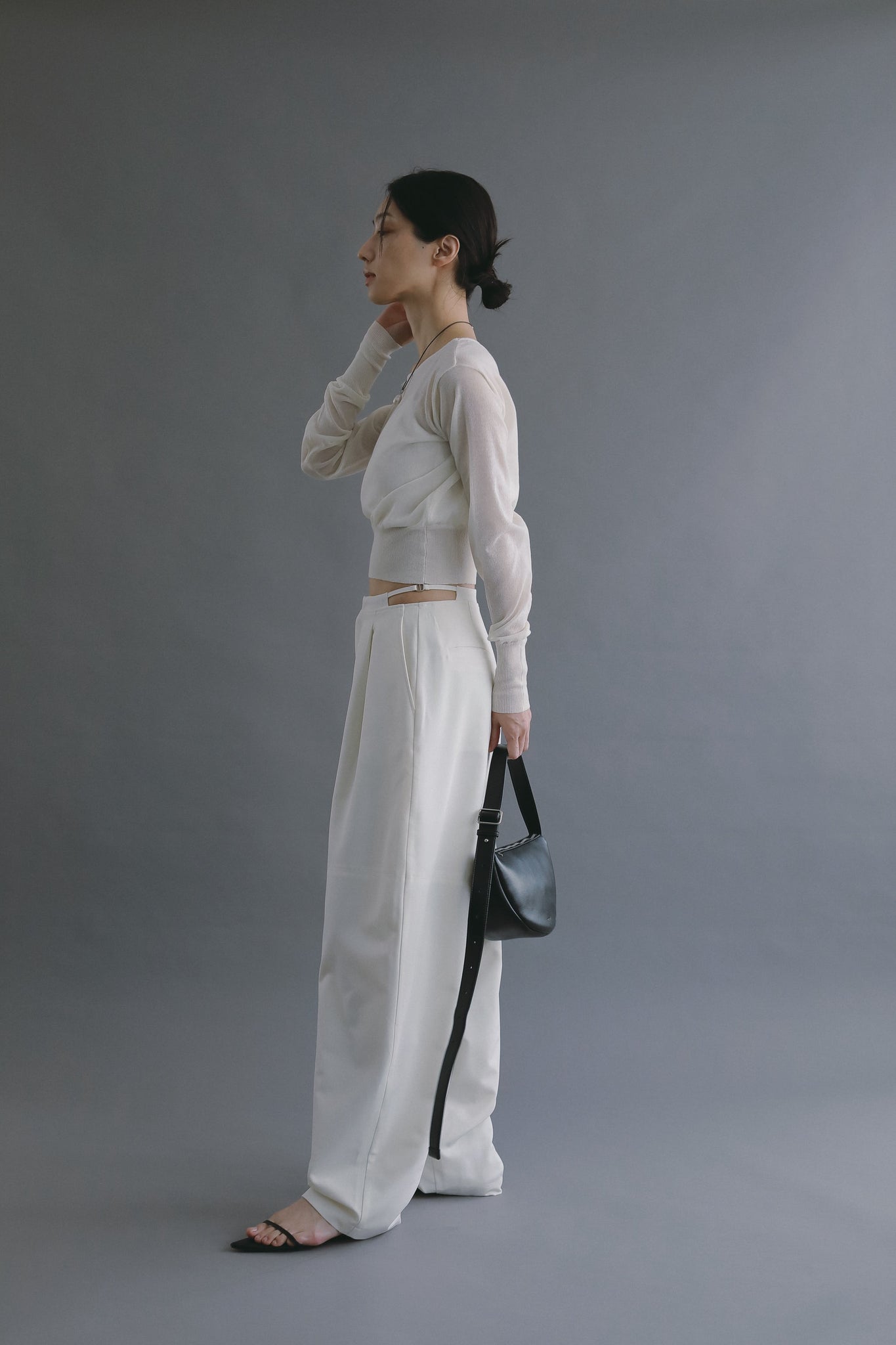 さりげなく肌が覗くデザインが、スタイリングに軽やかさと抜け感をプラス。