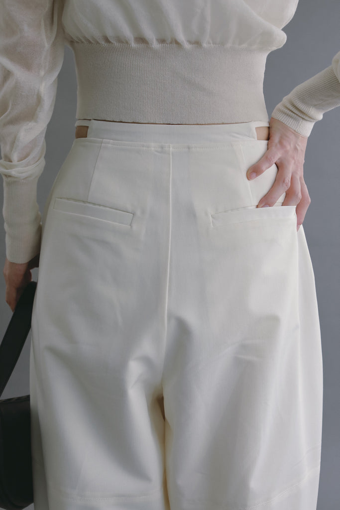 腰まわりに程よいゆとりを持たせつつ、裾に向かって丸みを帯びたフォルムが、スタイリングにモダンな印象を与えます。