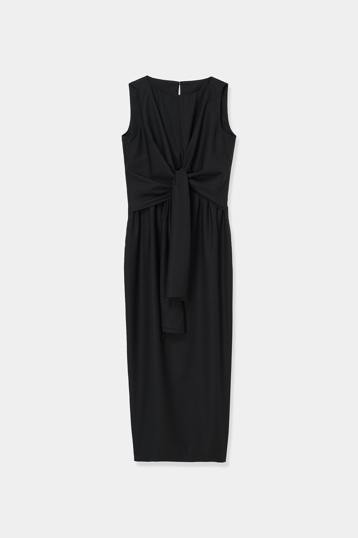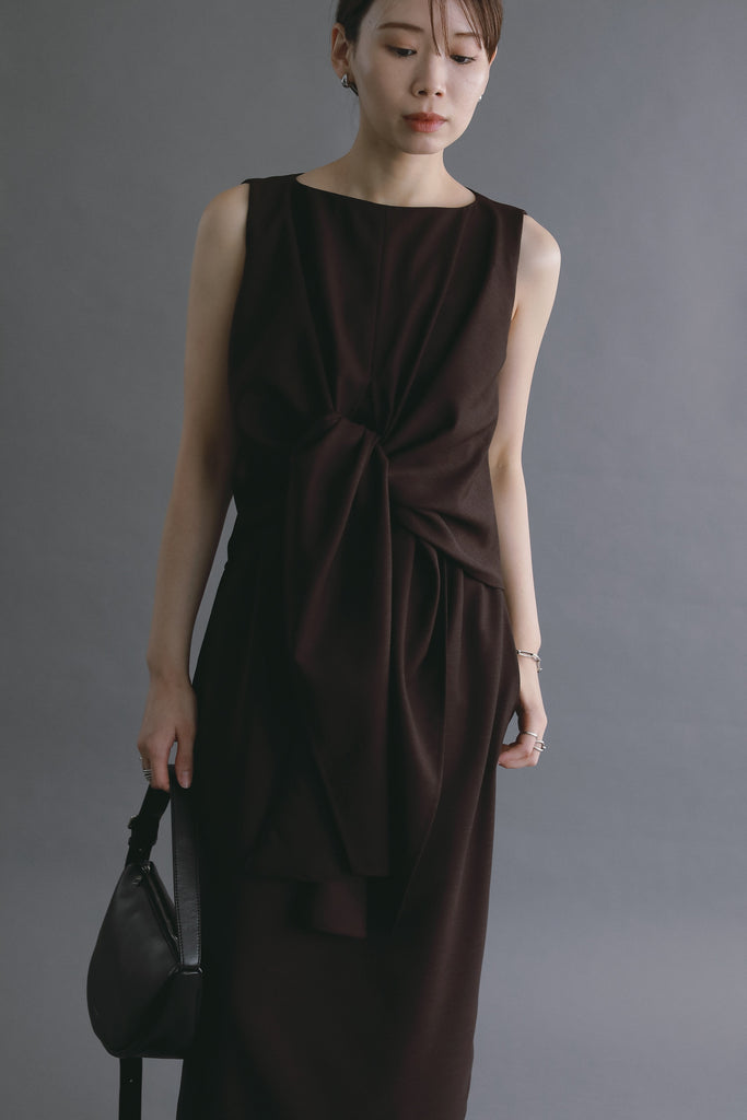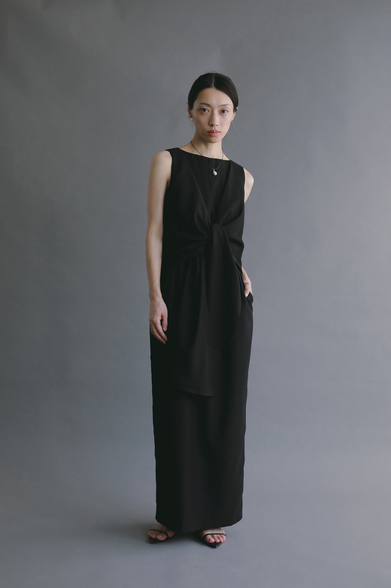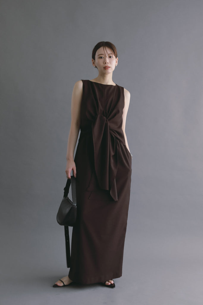 ウエスト部分で結ばれた大きなタイが、自然なドレープを生み出し、シンプルながらも視線を惹きつける一着です。