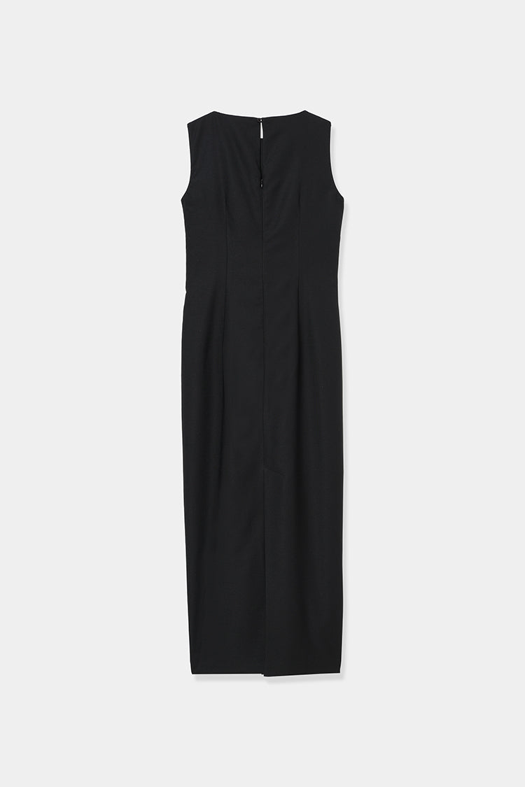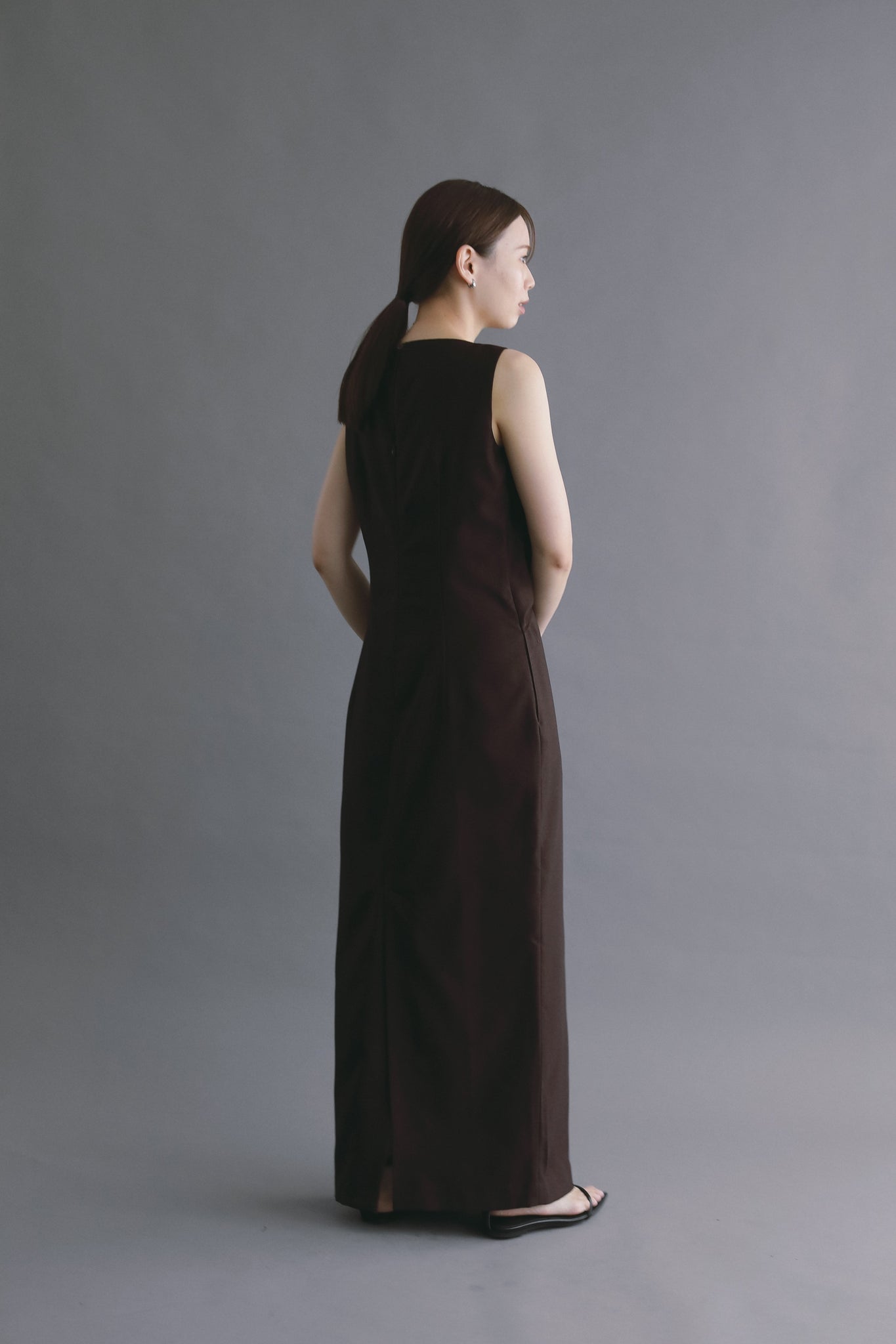 リネンライクな清涼感のある素材を使用した、フロントデザインが印象的なロングドレス。
