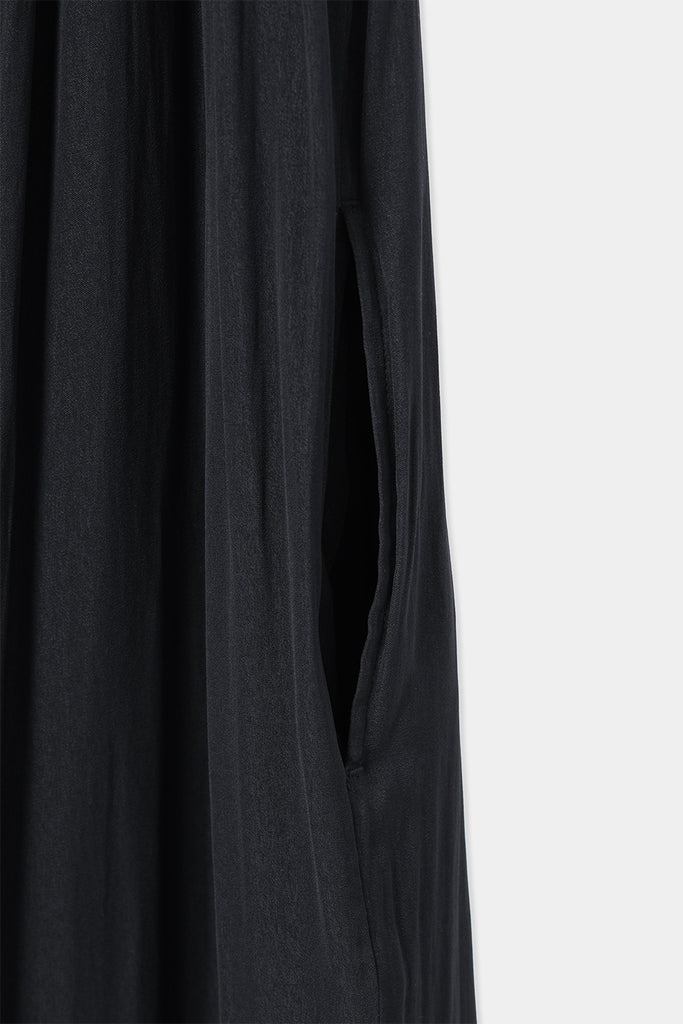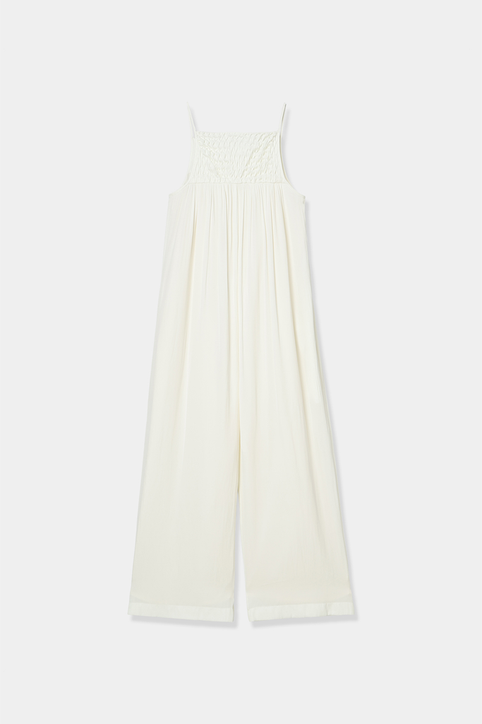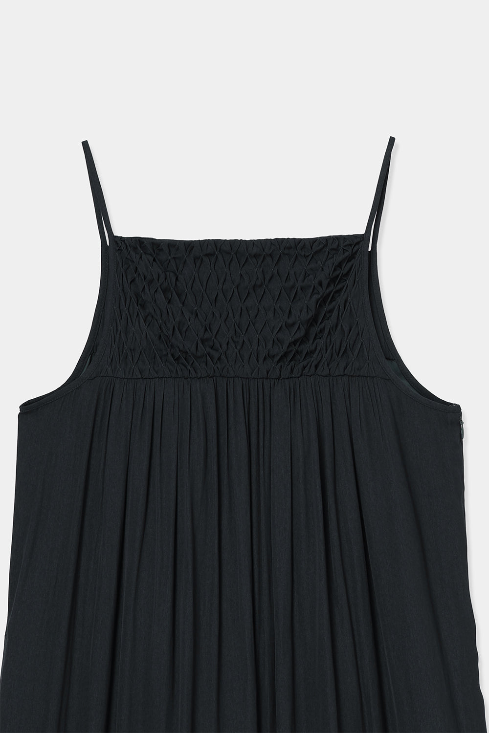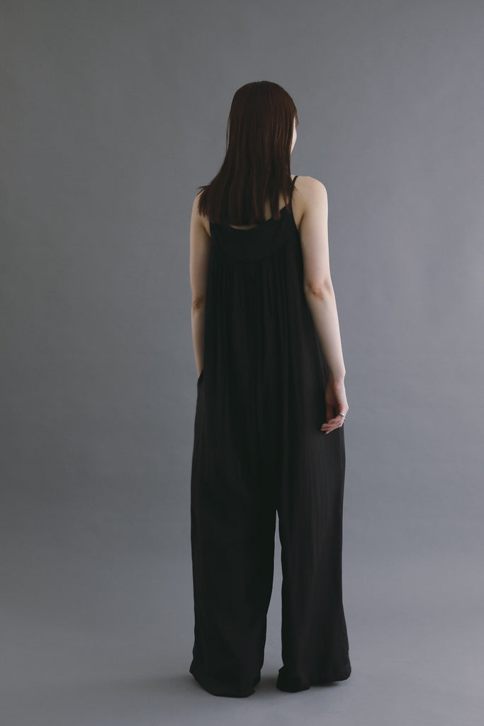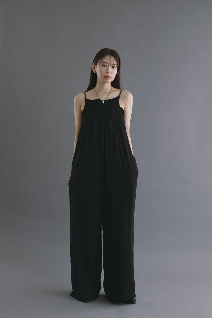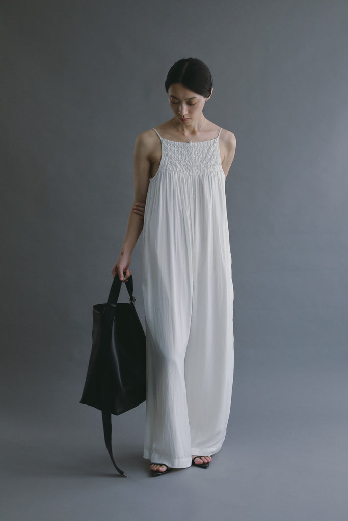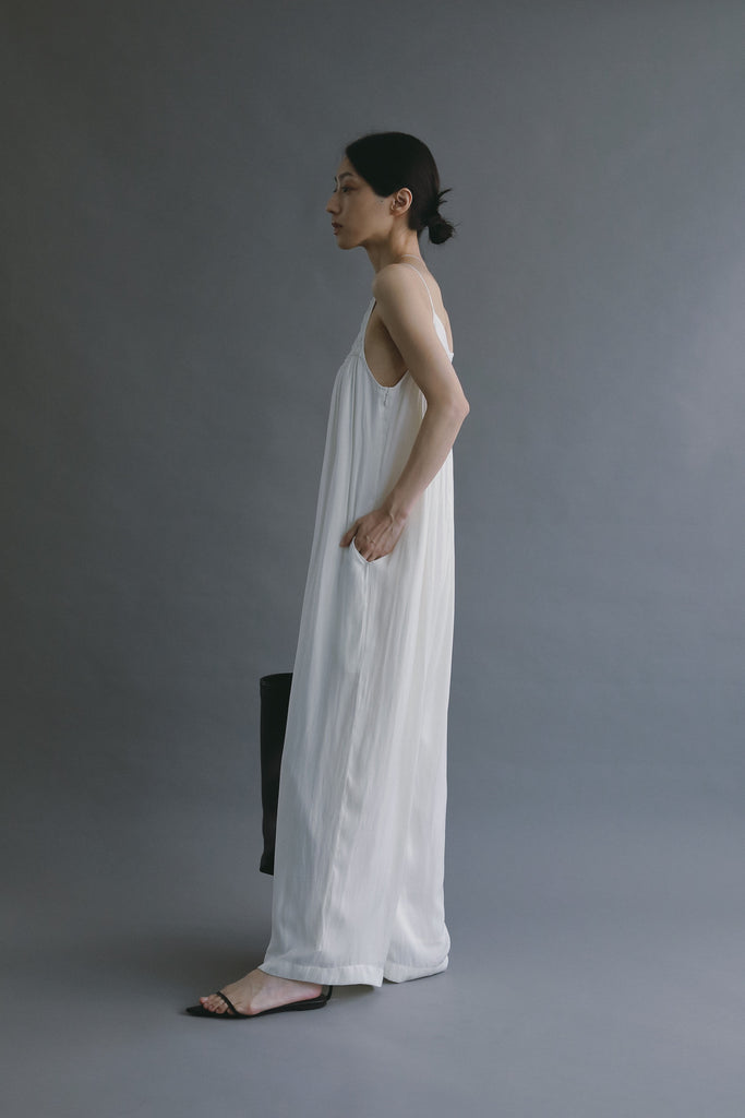 ストラップの華奢さとリラックス感のあるワイドシルエットとのコントラストが、抜け感のあるバランスを生み出し、一枚でスタイルを完成させる存在感のある仕上がりに。