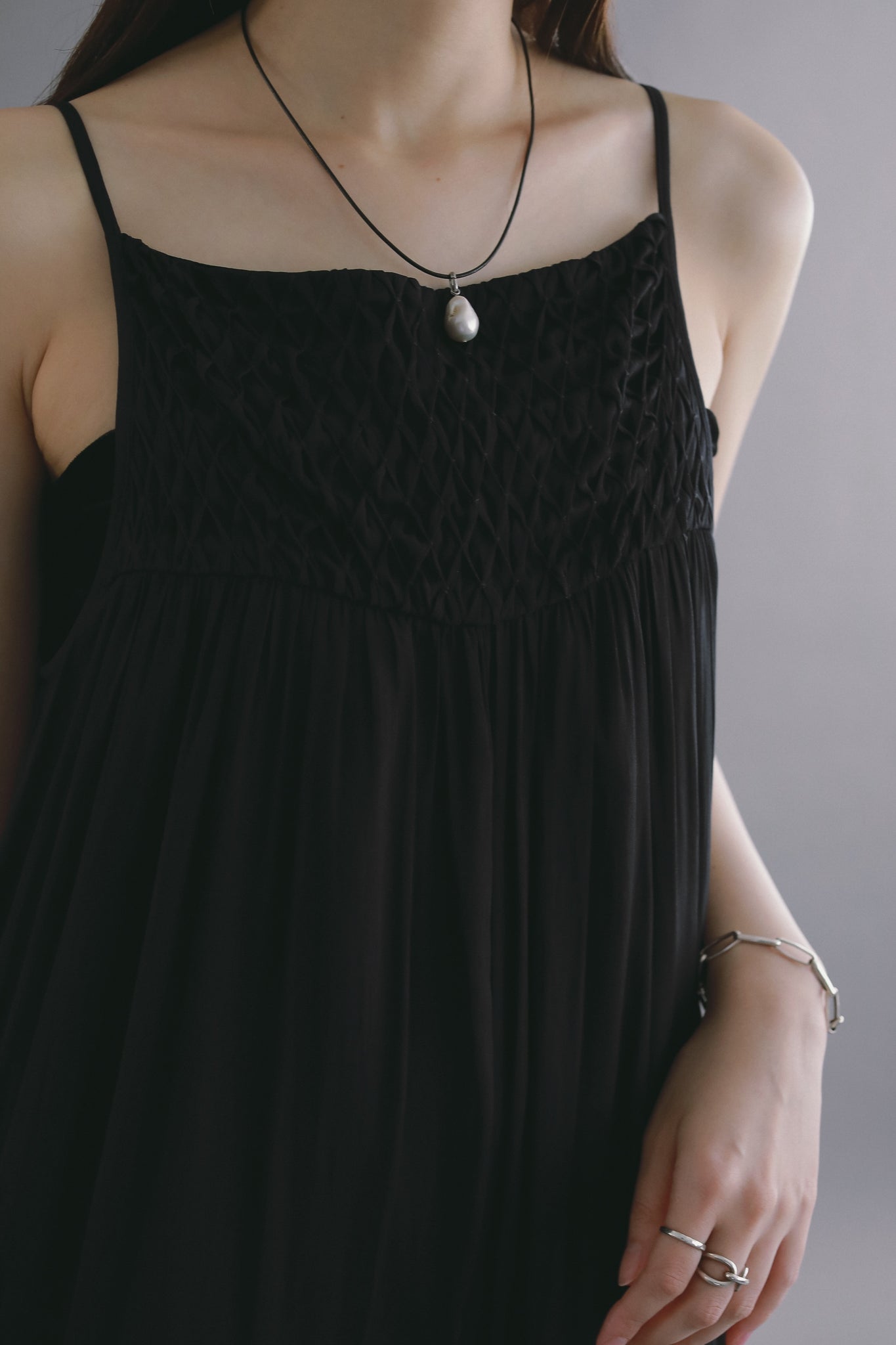 胸元にあしらわれたスモッキング刺繍が立体感と繊細さを際立たせ、視線を惹きつけるデザイン。