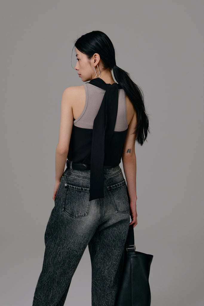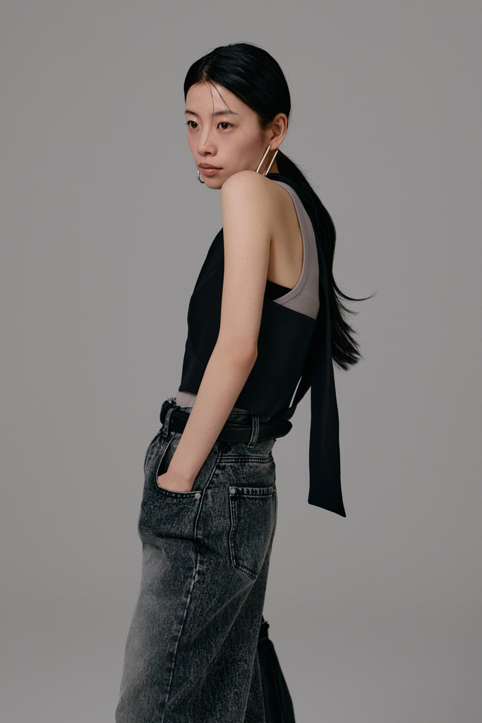バックにあしらわれたリボンを自由に結ぶことで、多彩なスタイリングを楽しめる仕様に。