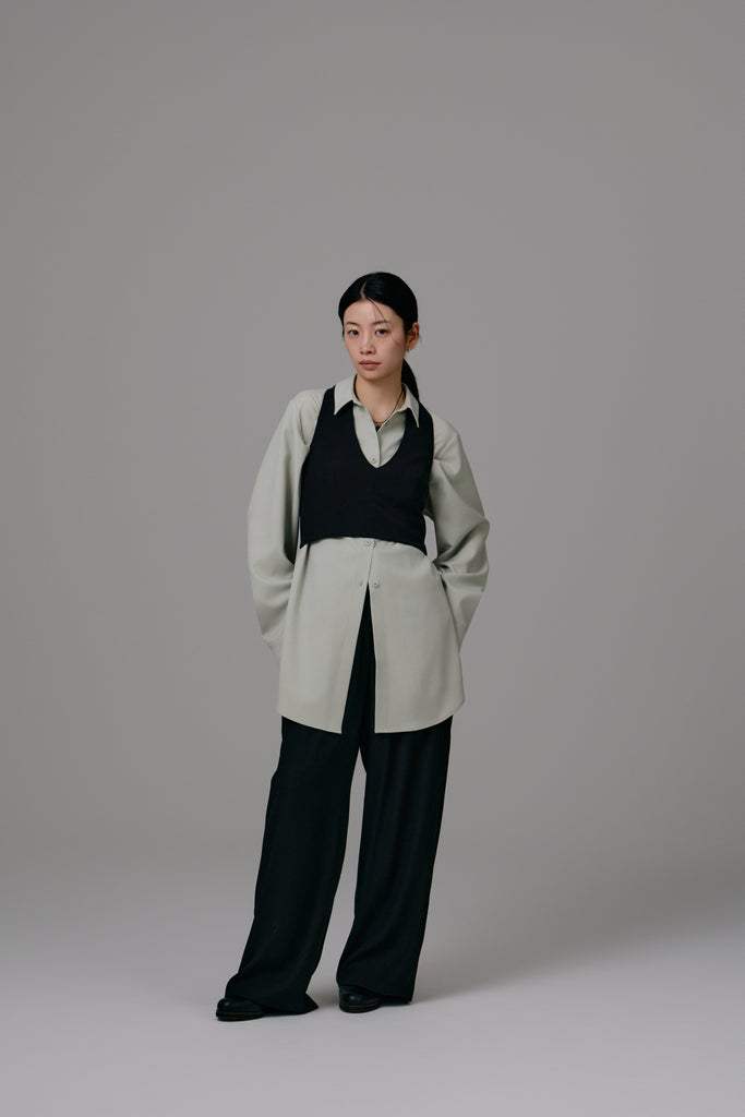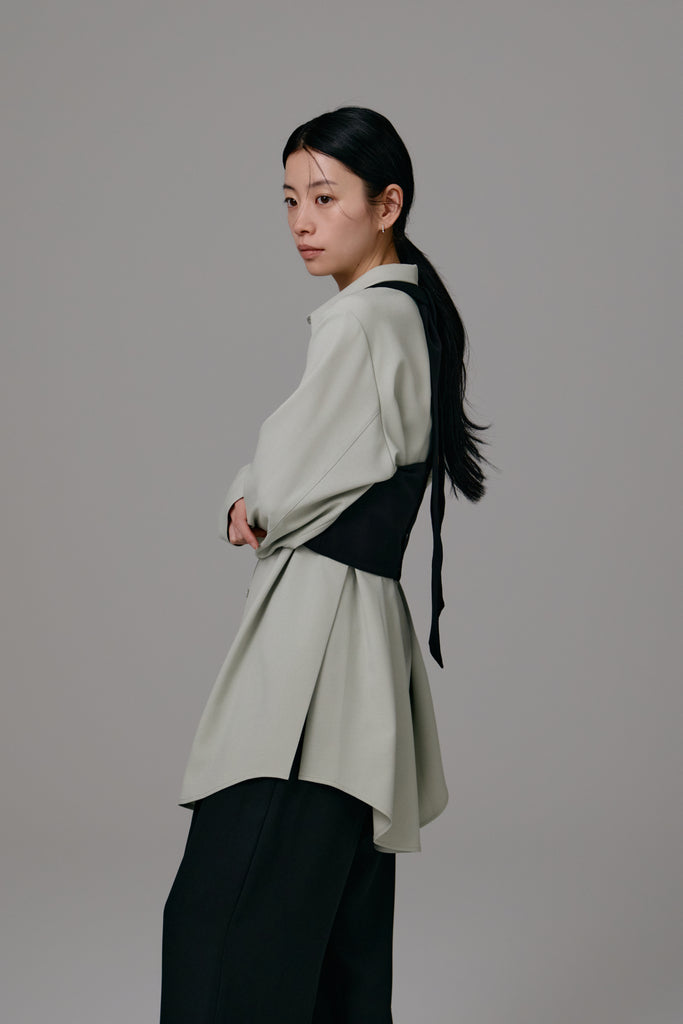 同素材のback satin straight pantsとの合わせはもちろん、シンプルなコーディネートにプラスするだけで洗練されたレイヤードスタイルが完成するプラスワンアイテムです。