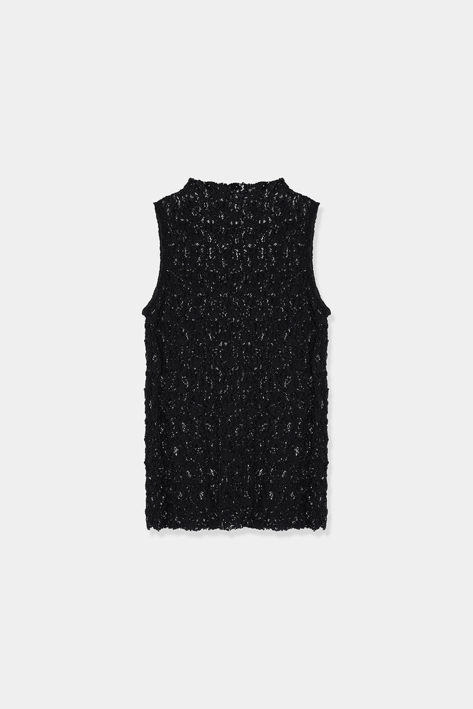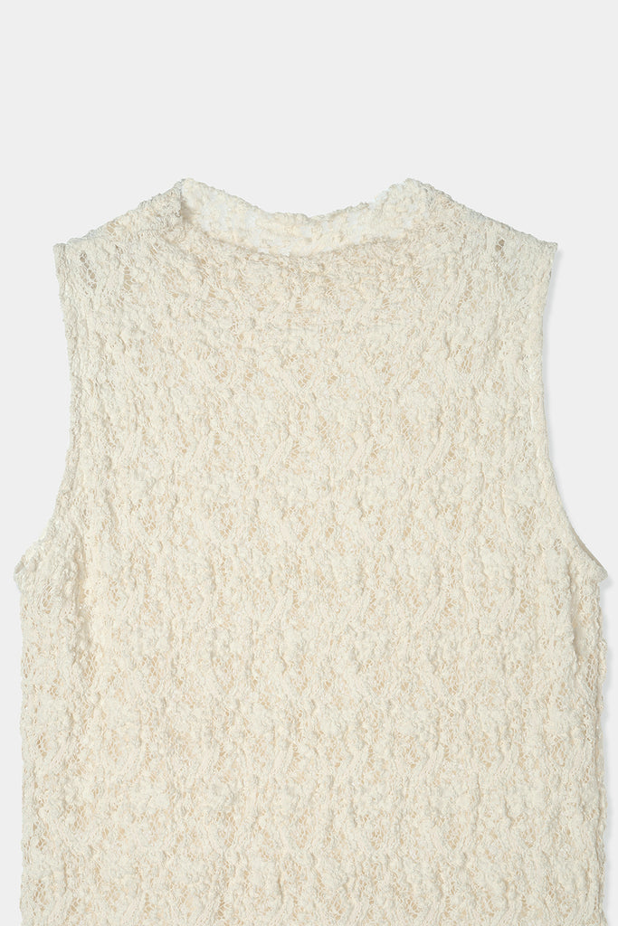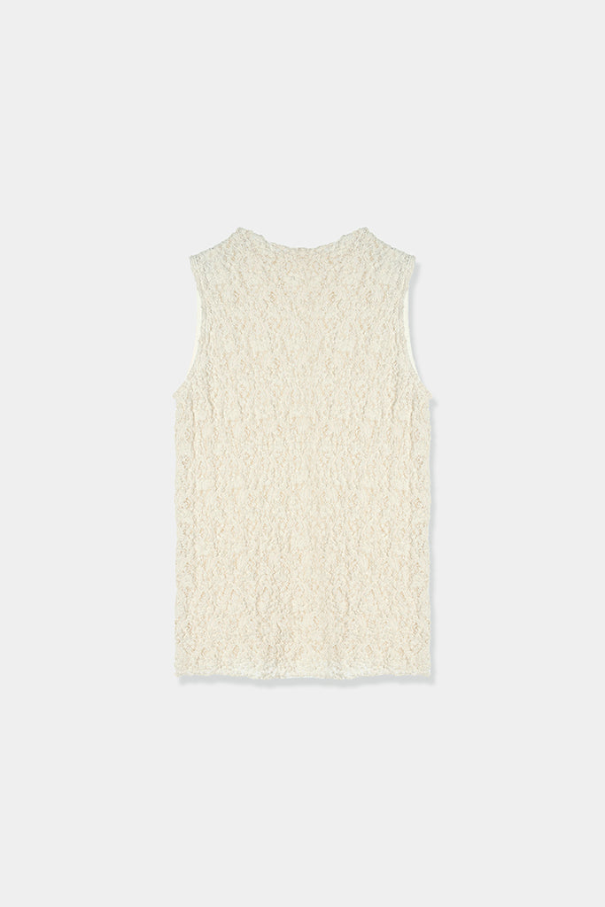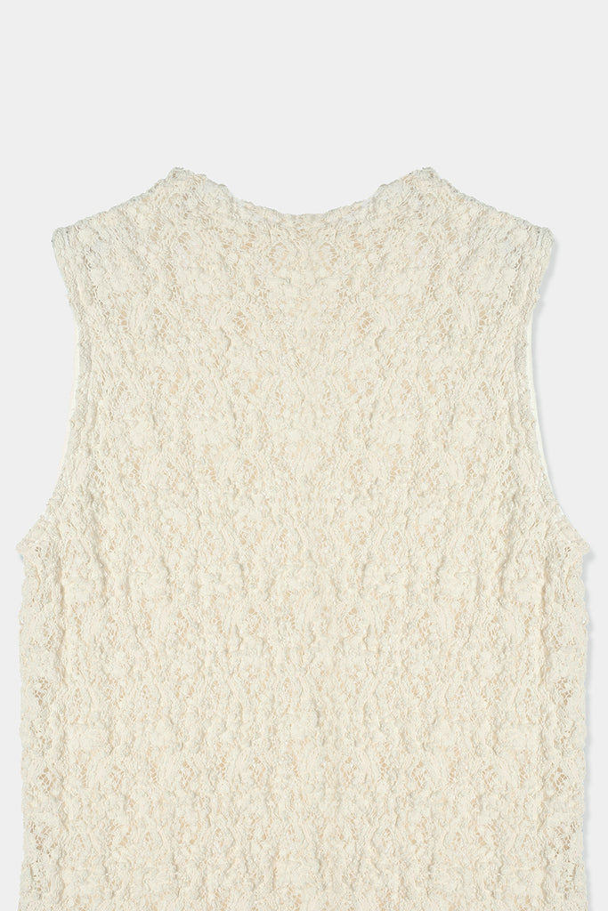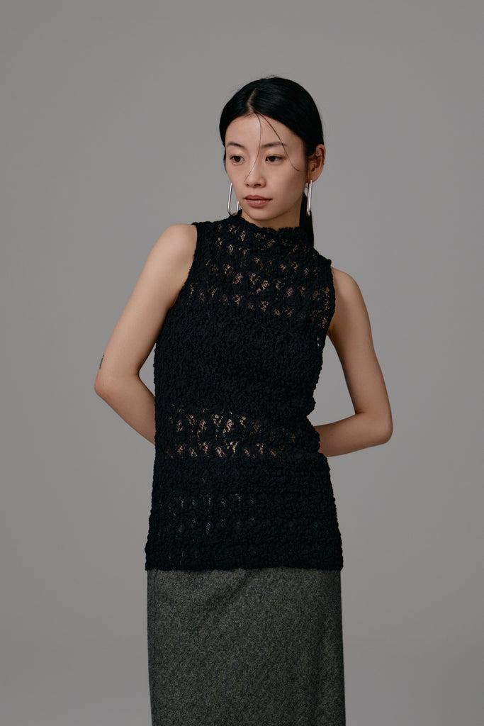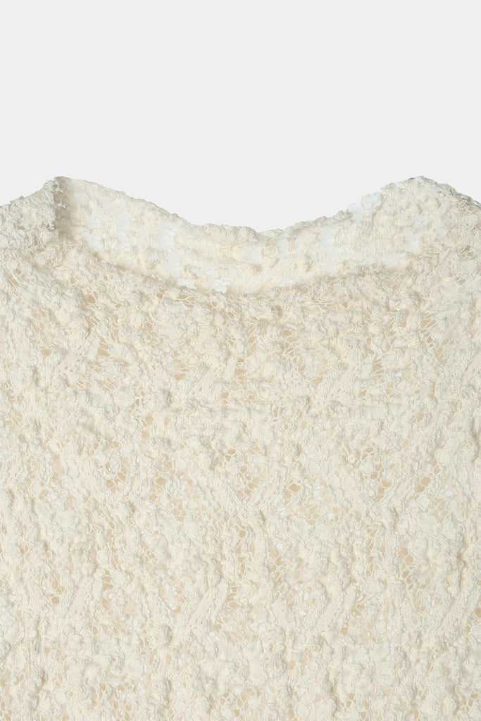 肌を程よく透かすレース素材が軽やかさを演出し、単品使いはもちろん、レイヤードスタイルにも映えるデザイン。