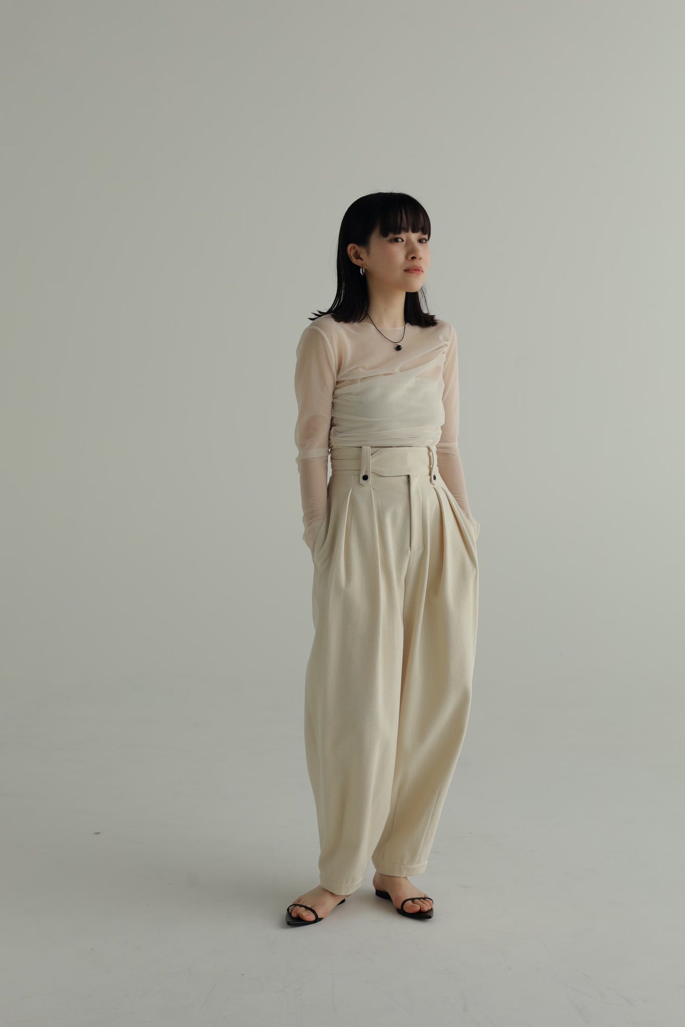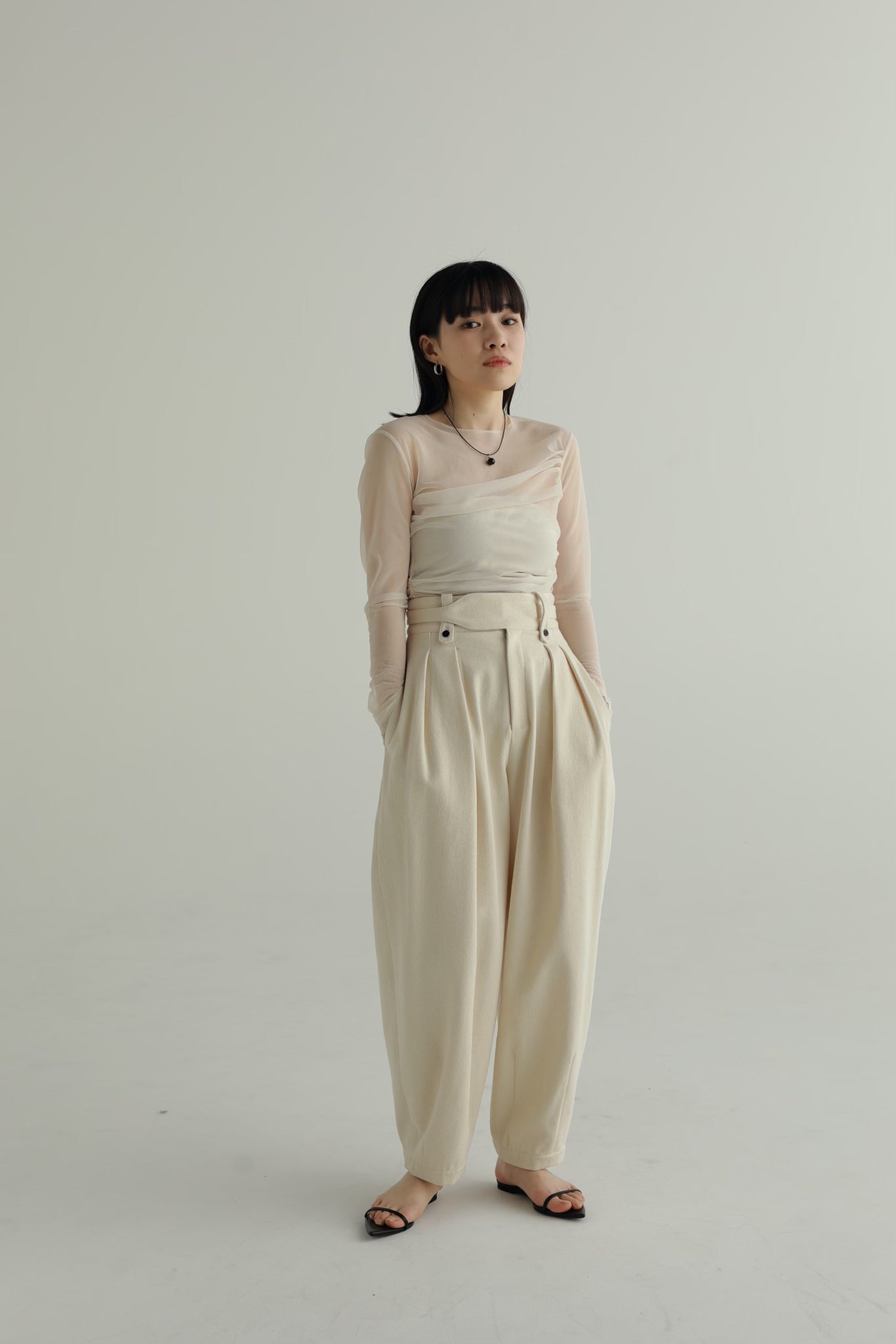 適度にフィット感のあるボディに、細身のアームがlourenらしいサイジング。ネックラインは詰まりすぎないクルーネック設定で抜け感をプラスしています。