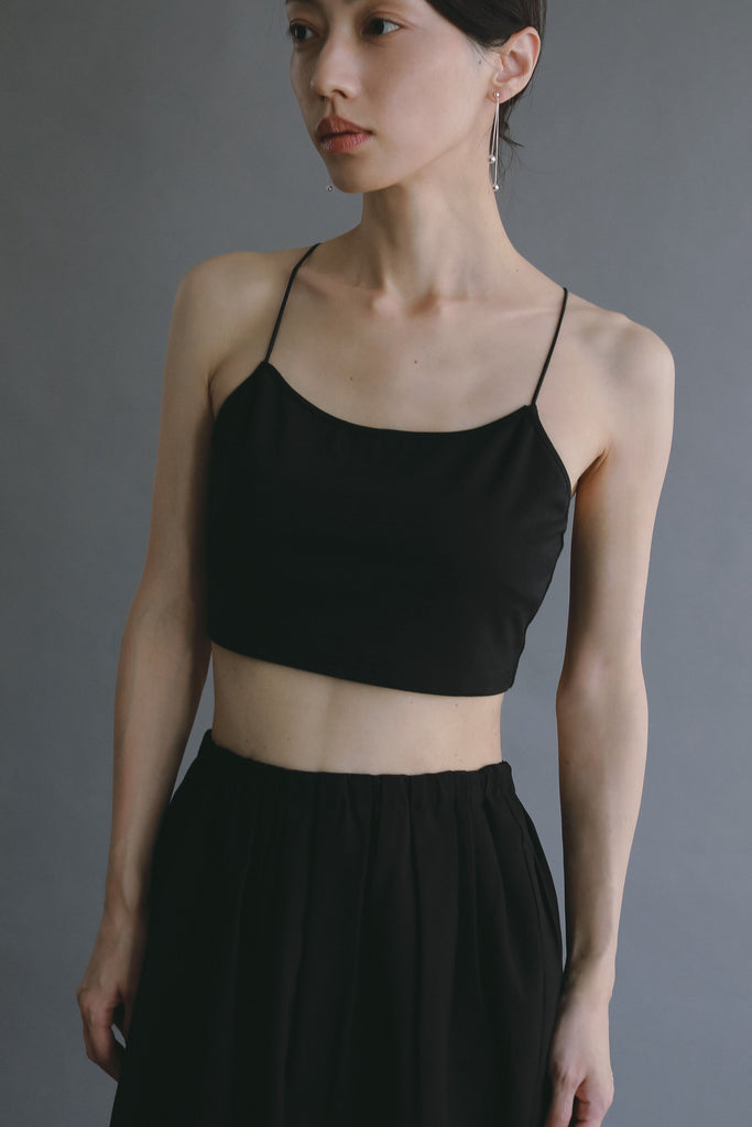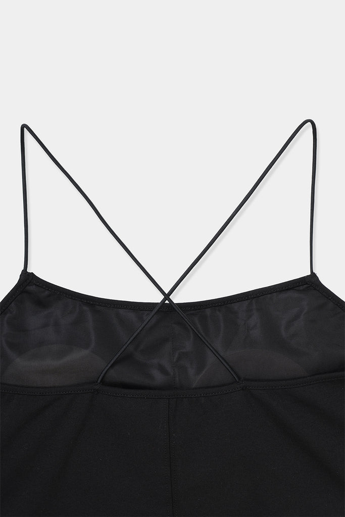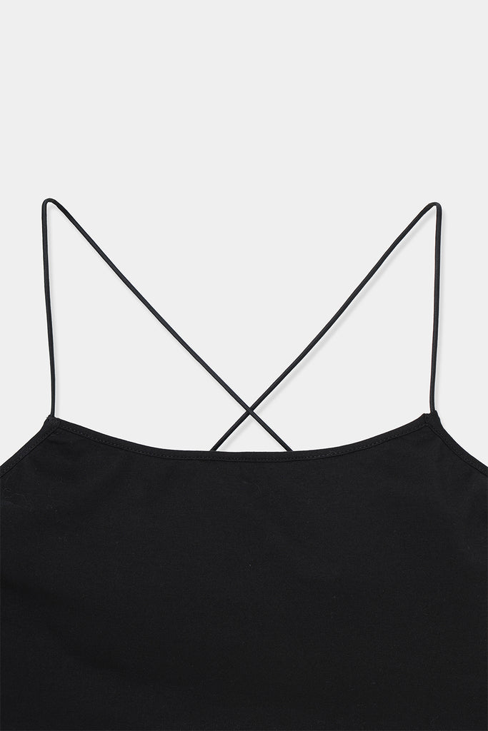 華奢なストラップが背中で交差するデザインは、シンプルなトップスやシアー素材のアイテムと重ねたときにさりげないアクセントに。