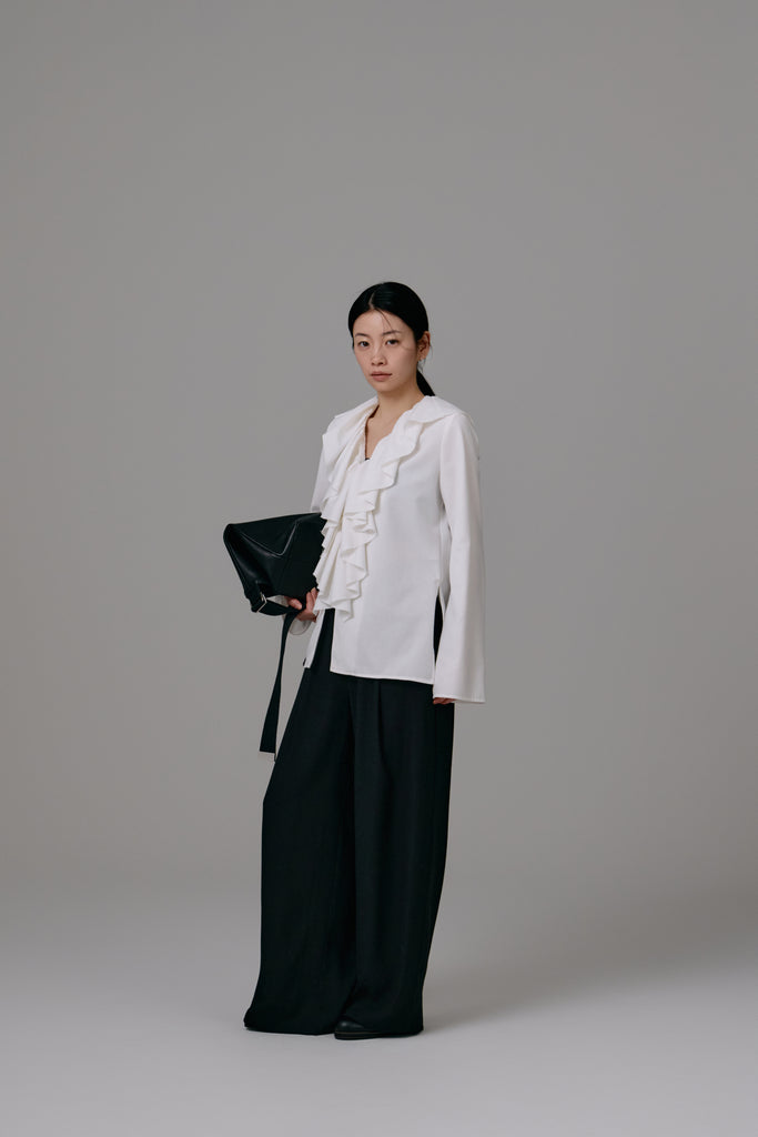 シンプルなデザインながら、バックサテン地のさらりとした落ち感のある生地を採用することで綺麗なシルエットを実現。