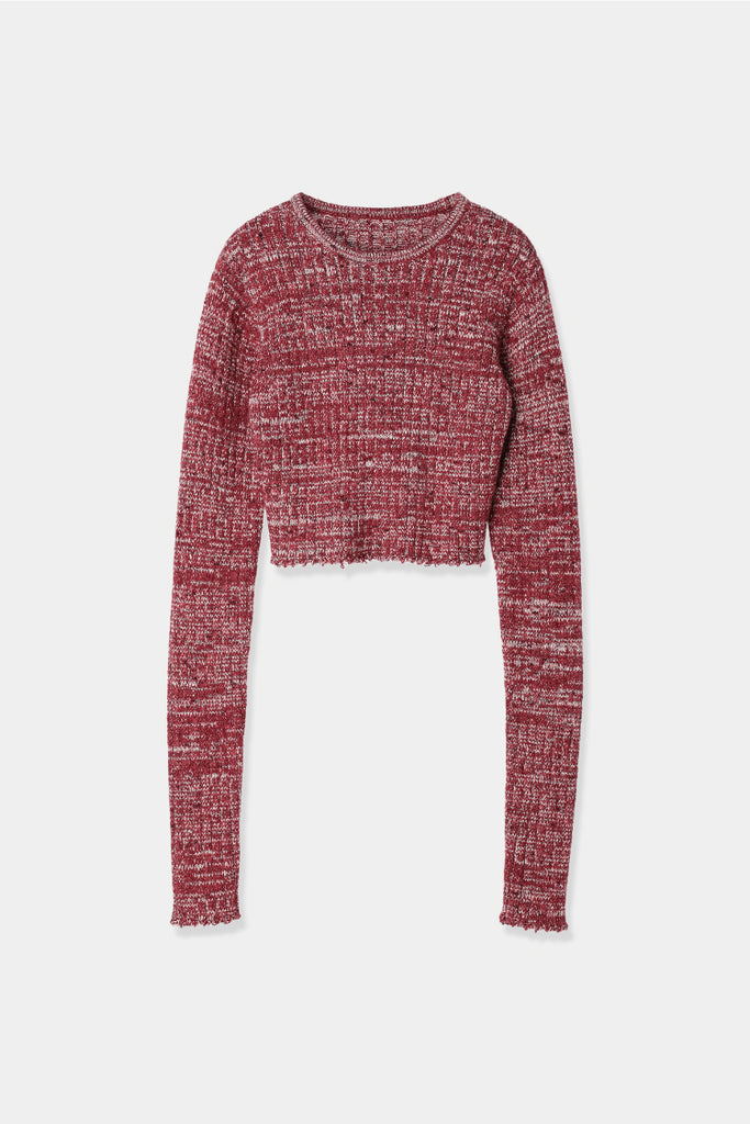 ミックス糸を使用した表情のある編み地が魅力のクロップドニット。