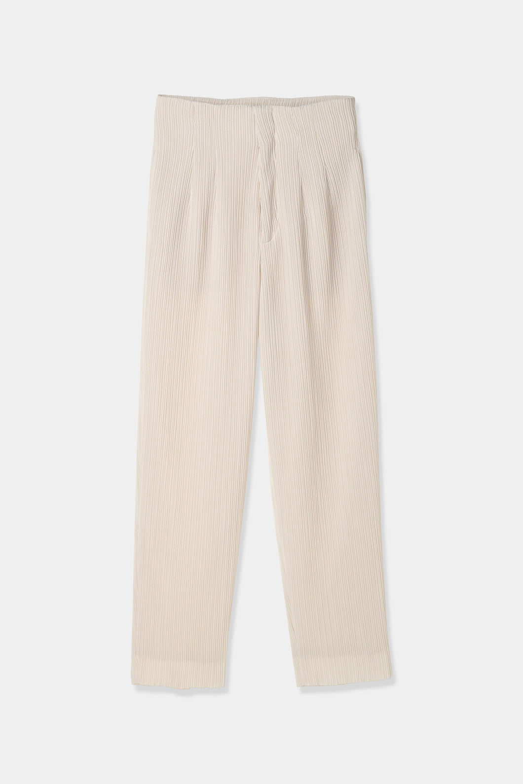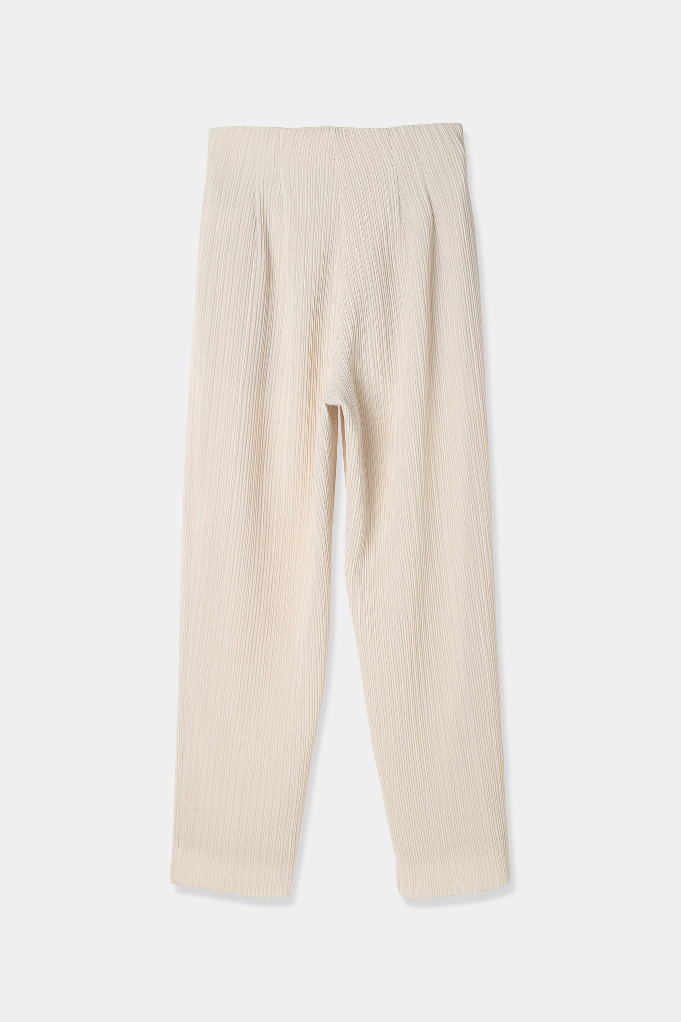 表情のある細かいプリーツがリラクシーな雰囲気をもたらすテーパードパンツ。