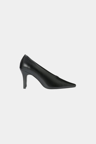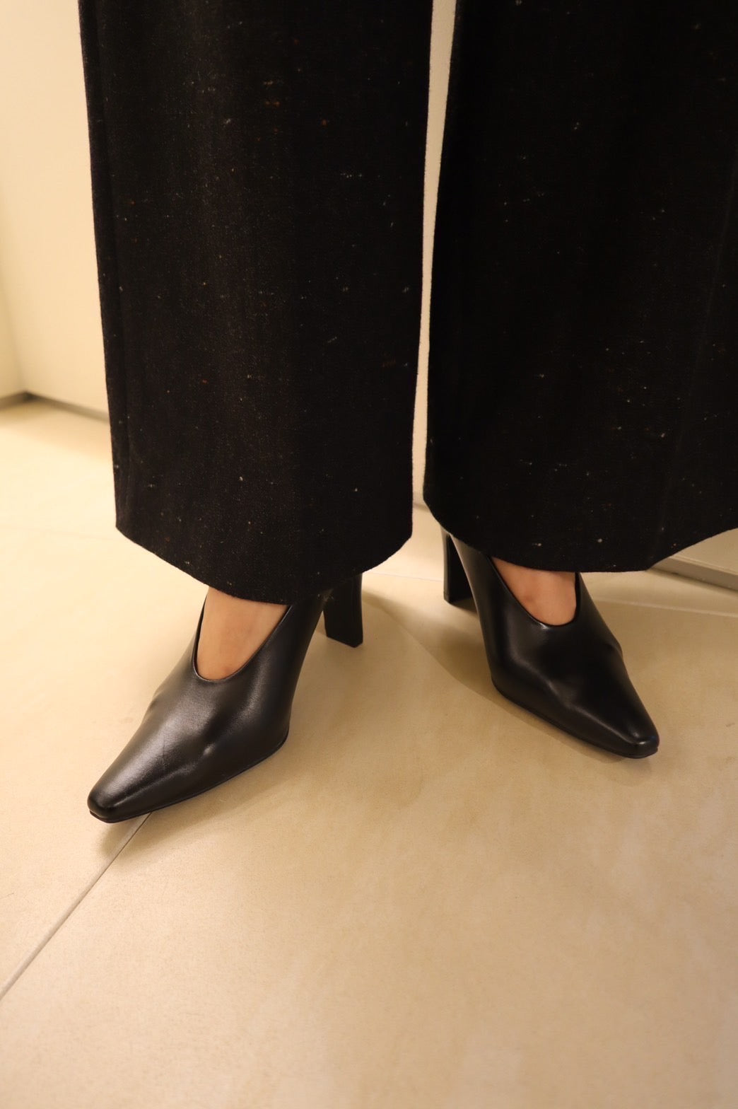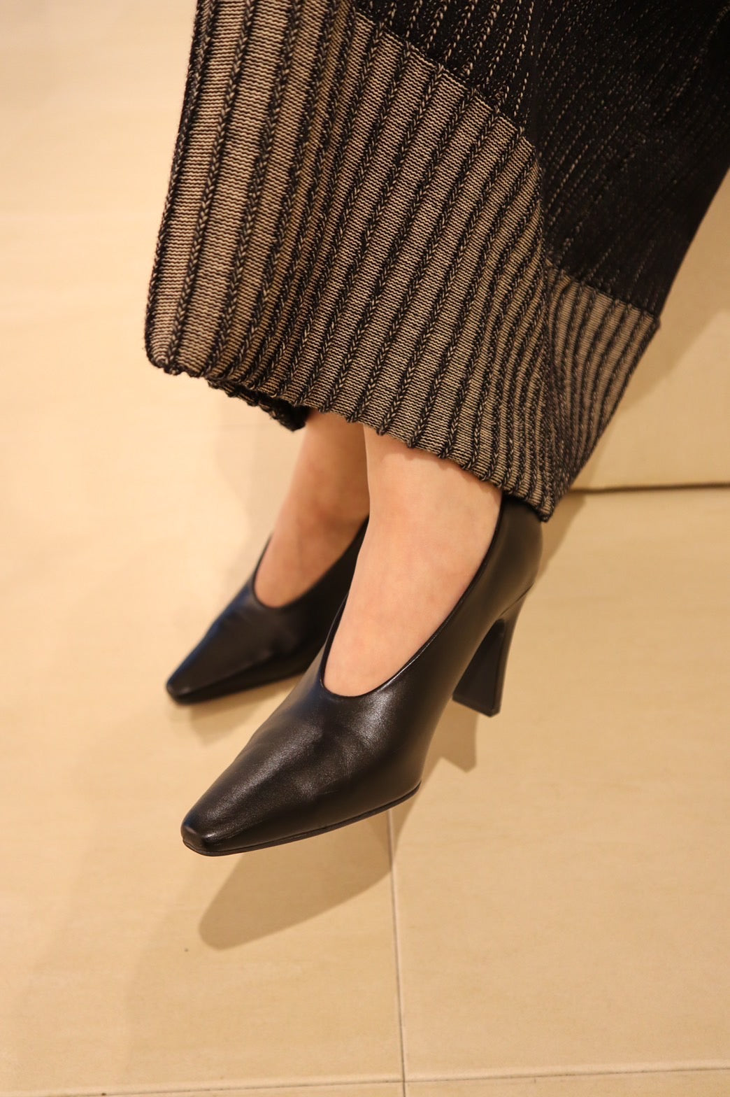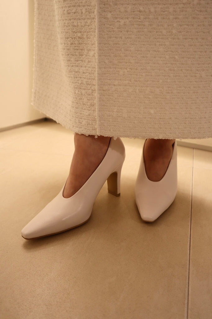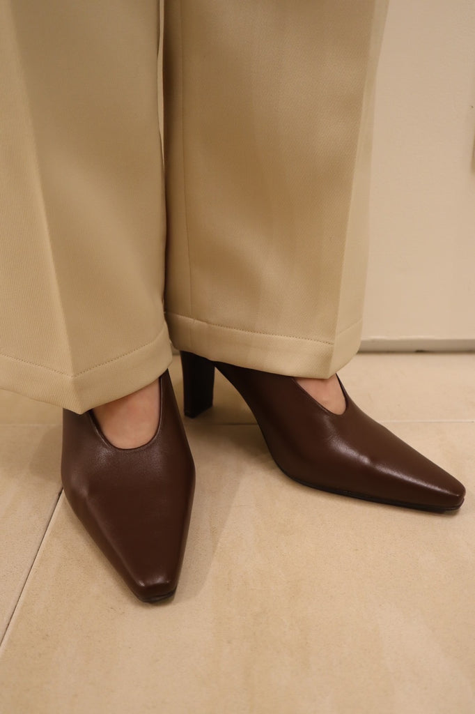 シューズボディは細く、ポインテッドトゥ先を長めに設定し、マニッシュな印象に仕上げたパンプス。
