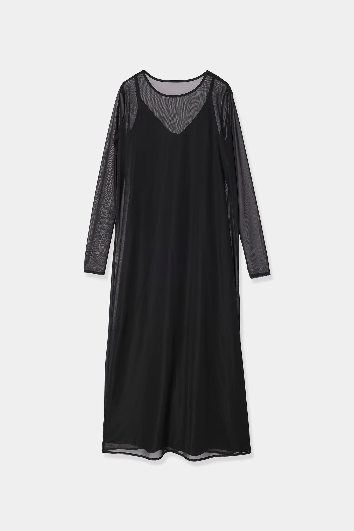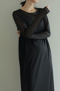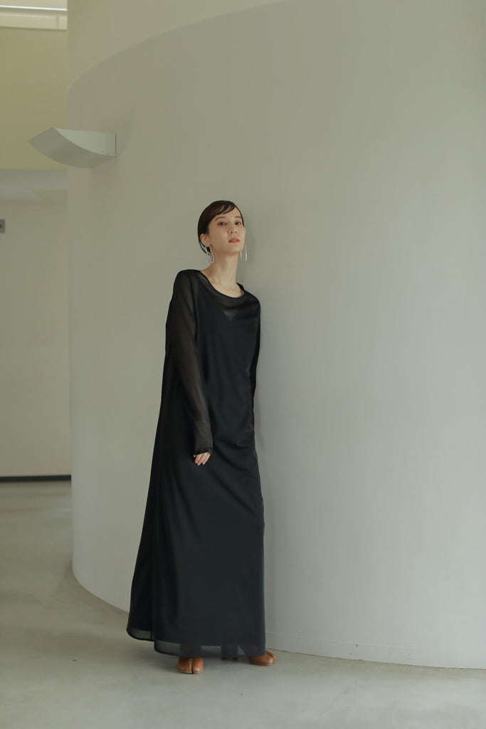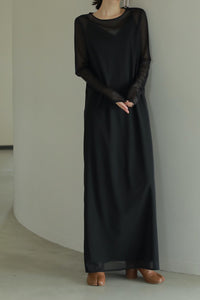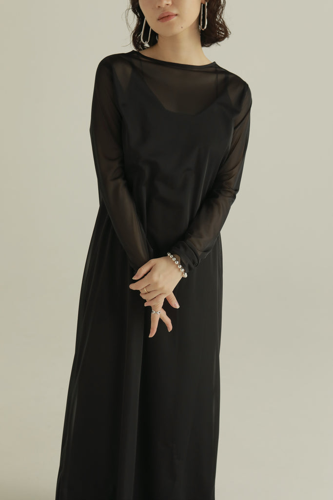 透け感のあるシースルードレスと、程よく光沢のあるベロアキャミソールドレスがセットになったレイヤードドレス。