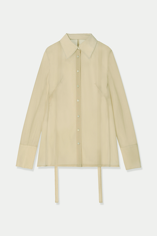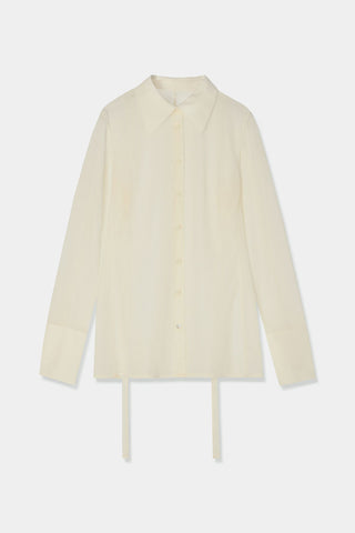 シワのつきにくい表面感のあるシアー素材でお仕立てした細身シルエットのシャツブラウス。