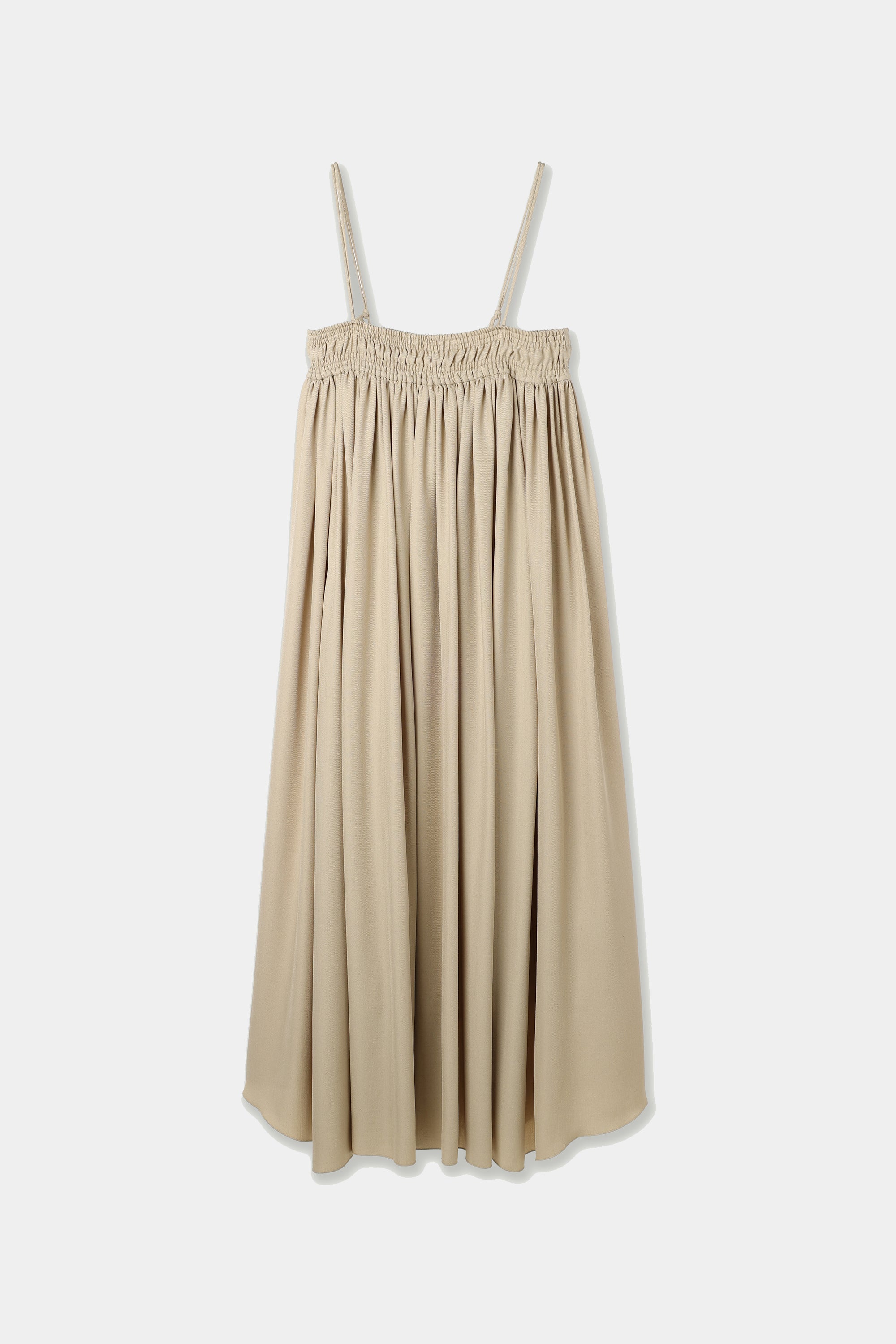たっぷりのギャザーと胸元のシャーリングデザインが特徴のボリュームドレス。
