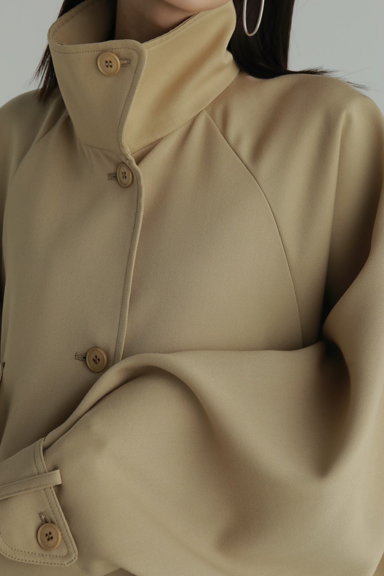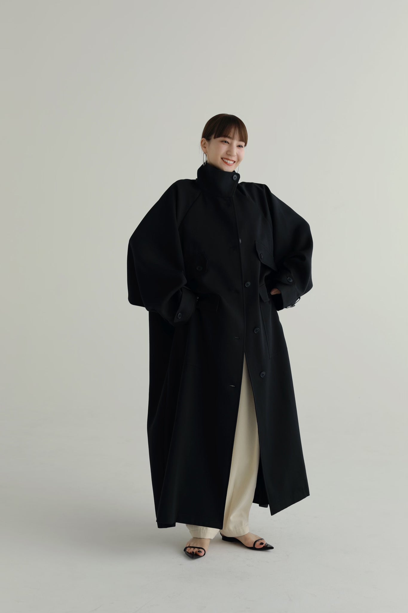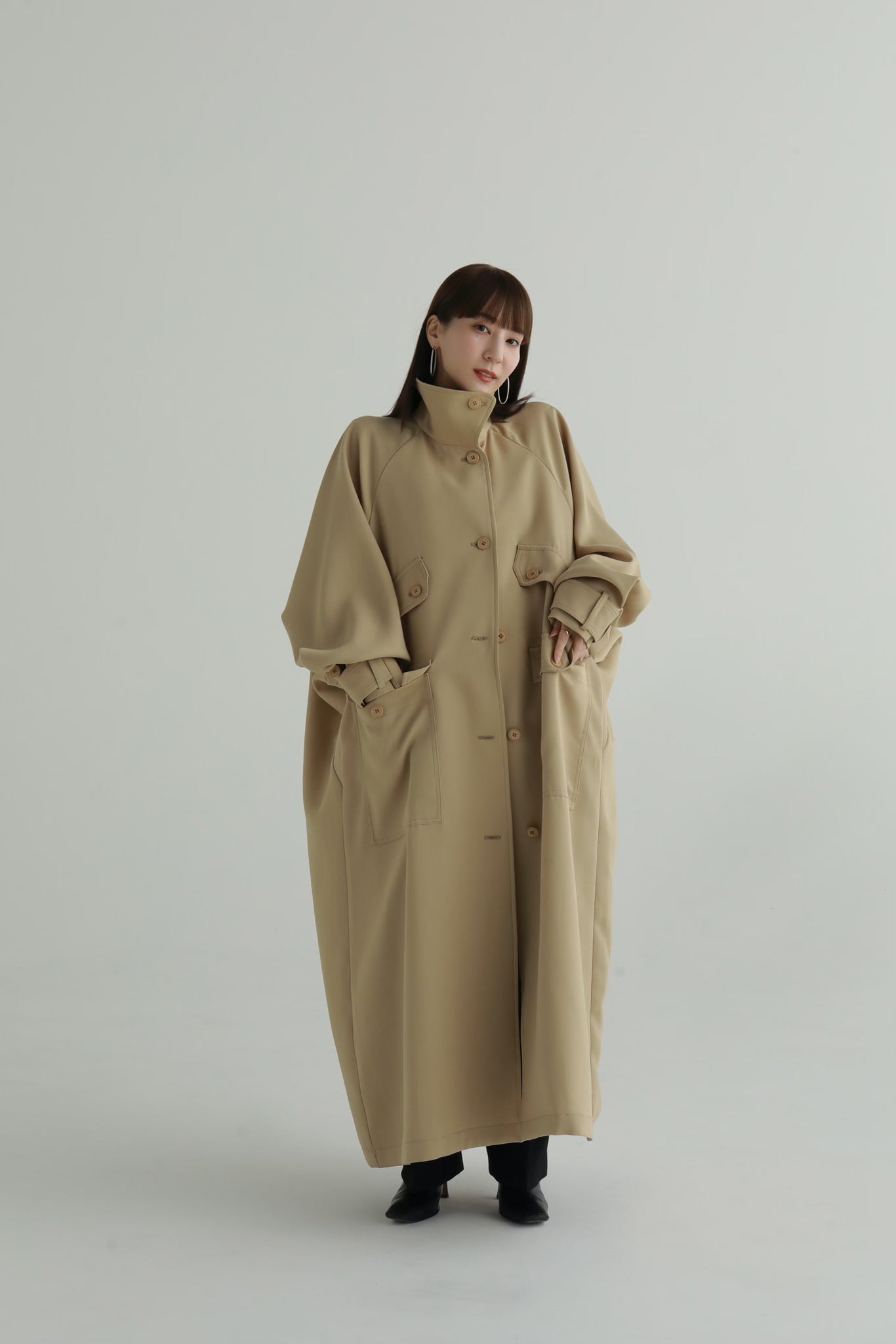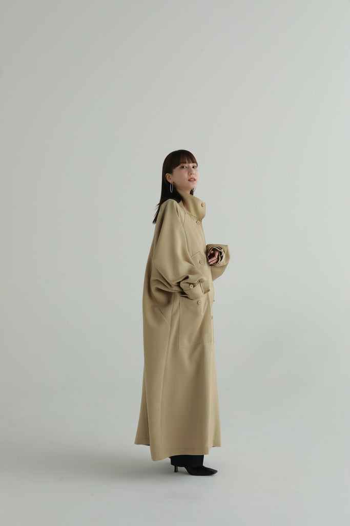 たっぷりとした分量感に緩やかなAラインシルエットでクラシカルな印象ながら、メンズライクな高めのスタンドカラーとやや太めのスリーブデザインで絶妙な抜け感をプラス。