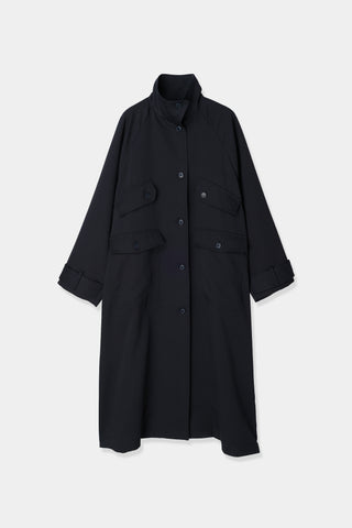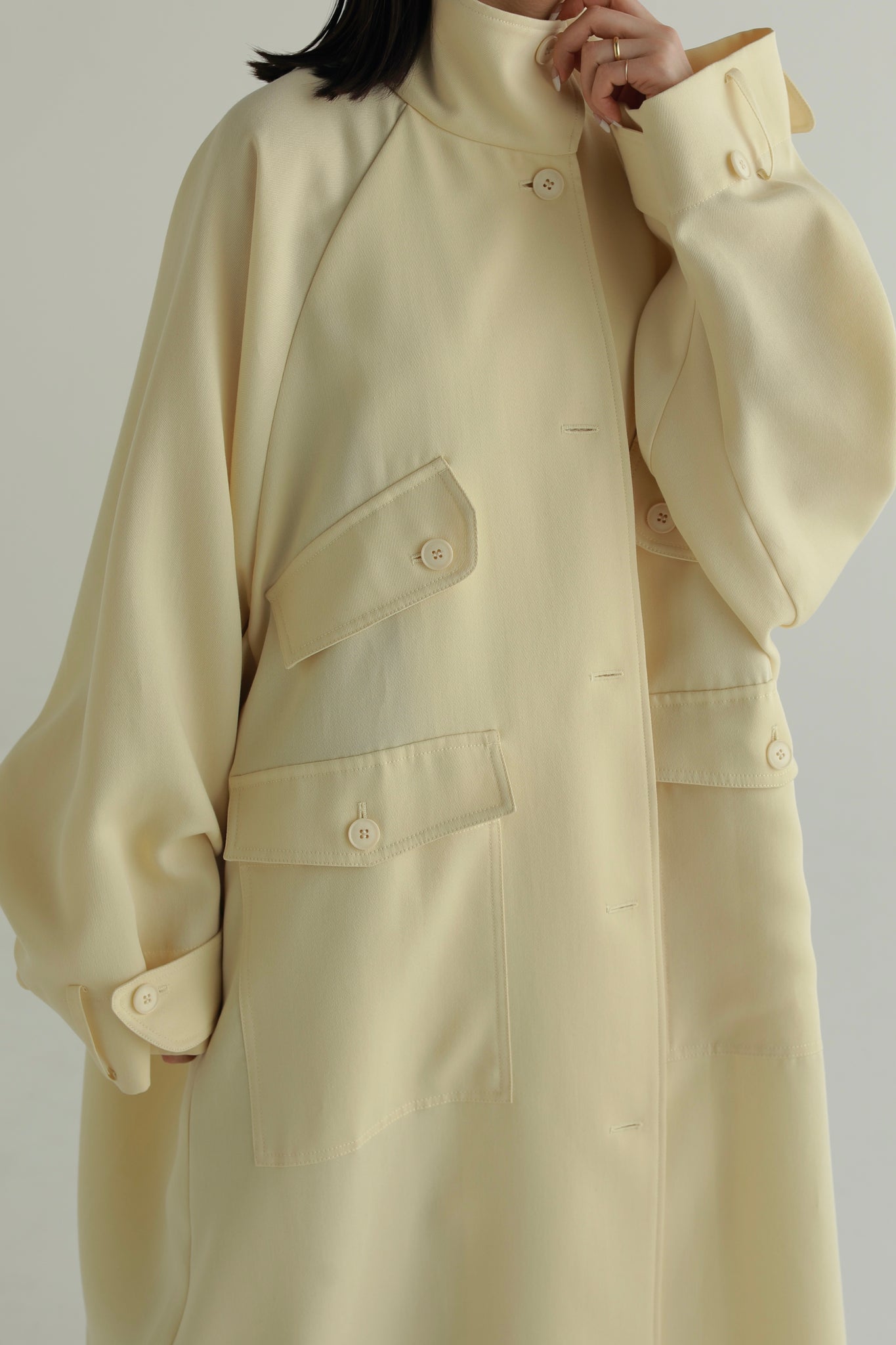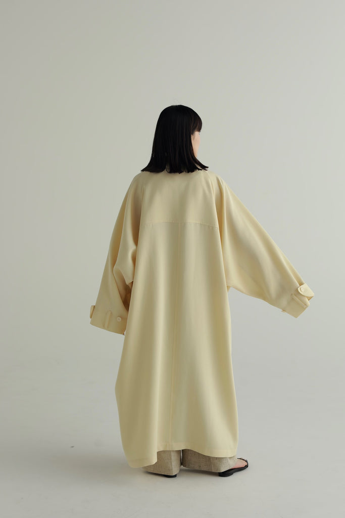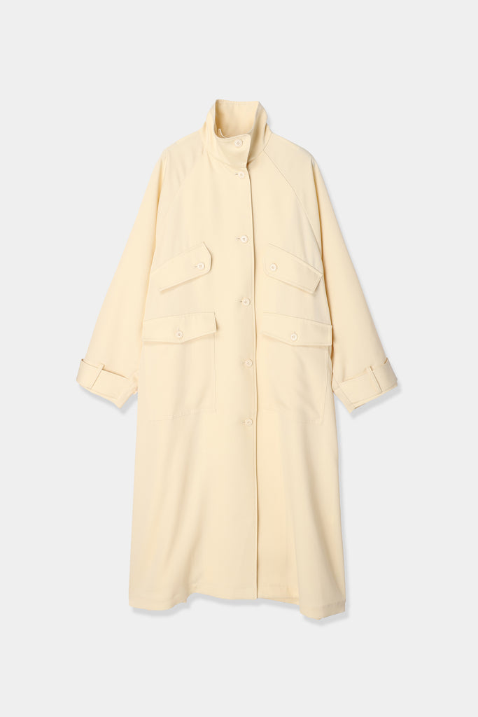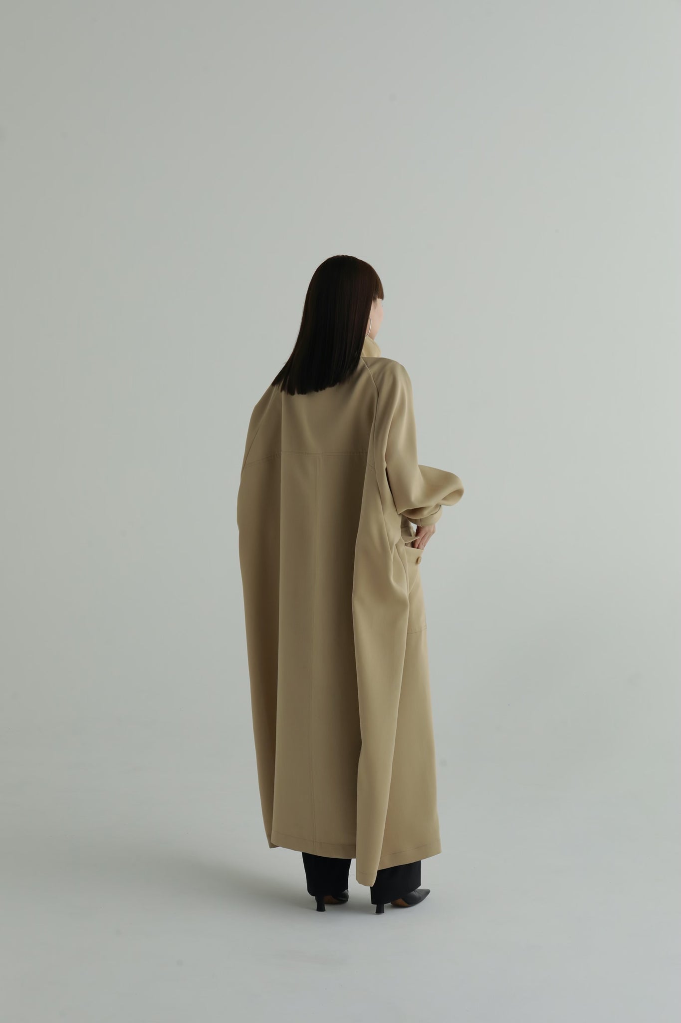 たっぷりとした分量感に緩やかなAラインシルエットでクラシカルな印象ながら、メンズライクな高めのスタンドカラーとやや太めのスリーブデザインで絶妙な抜け感をプラス。