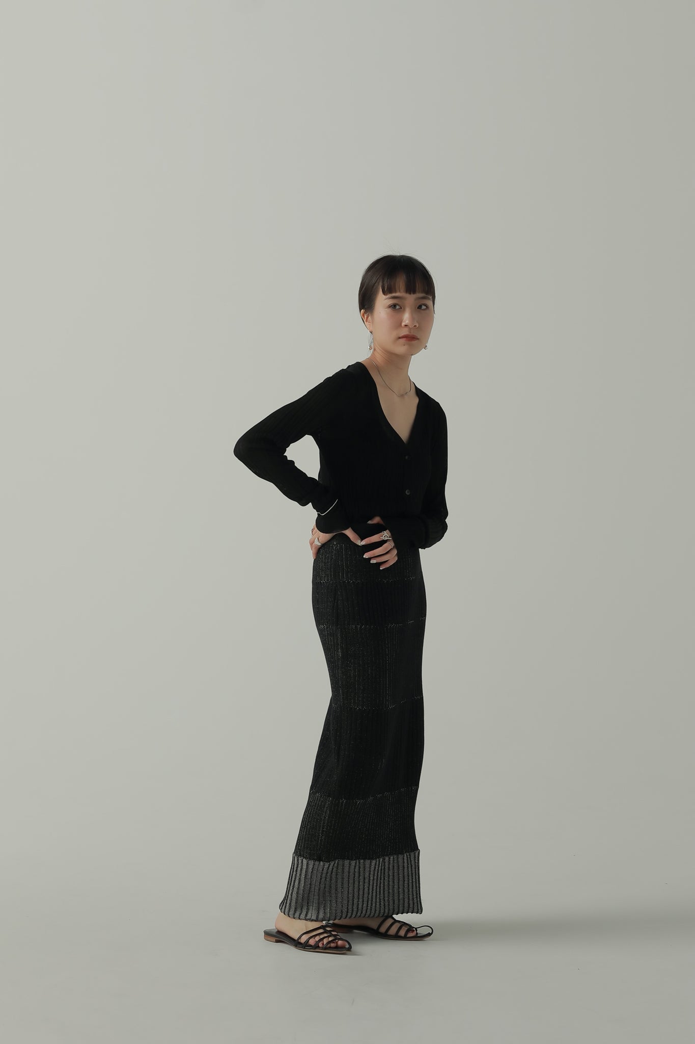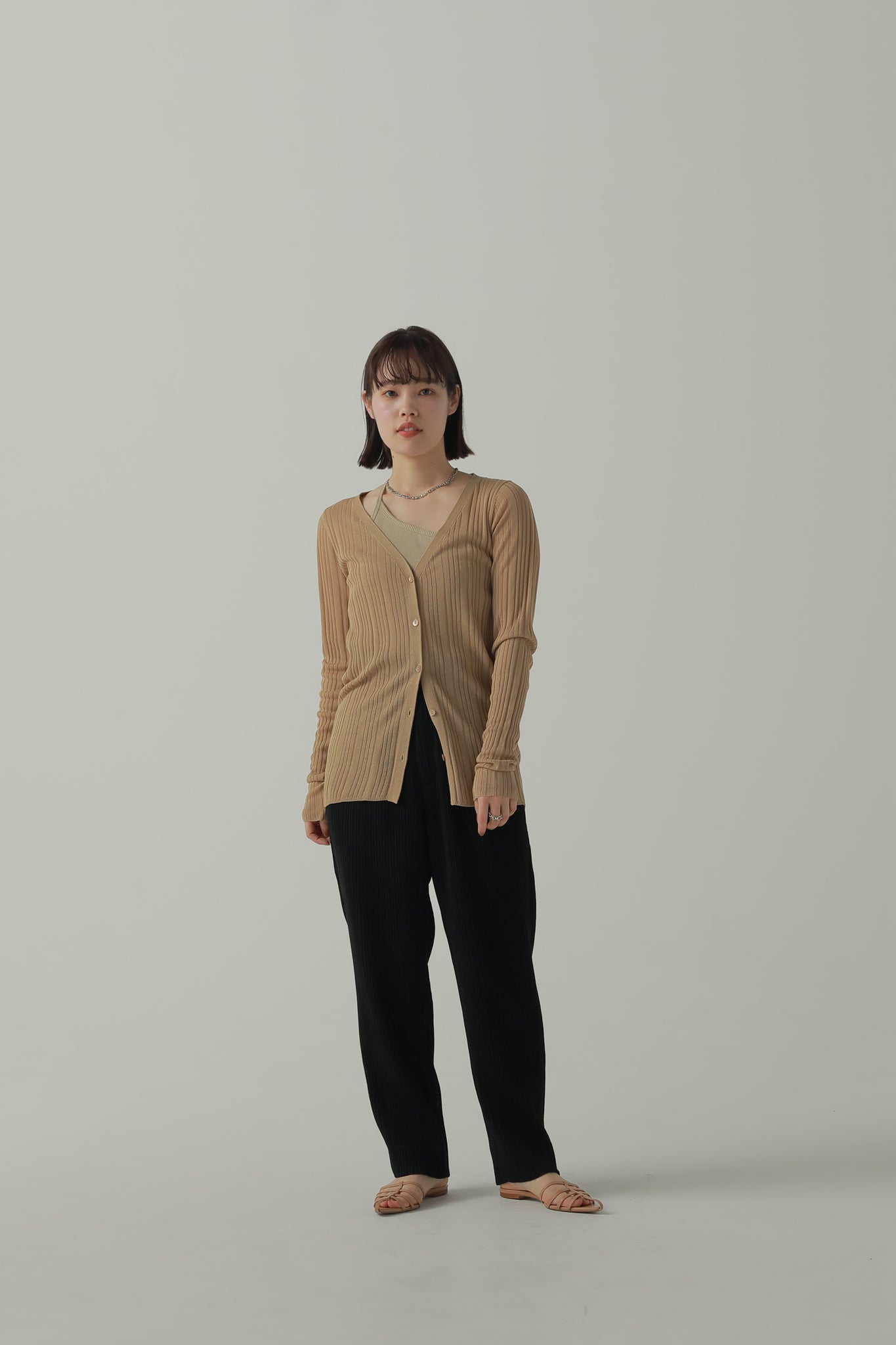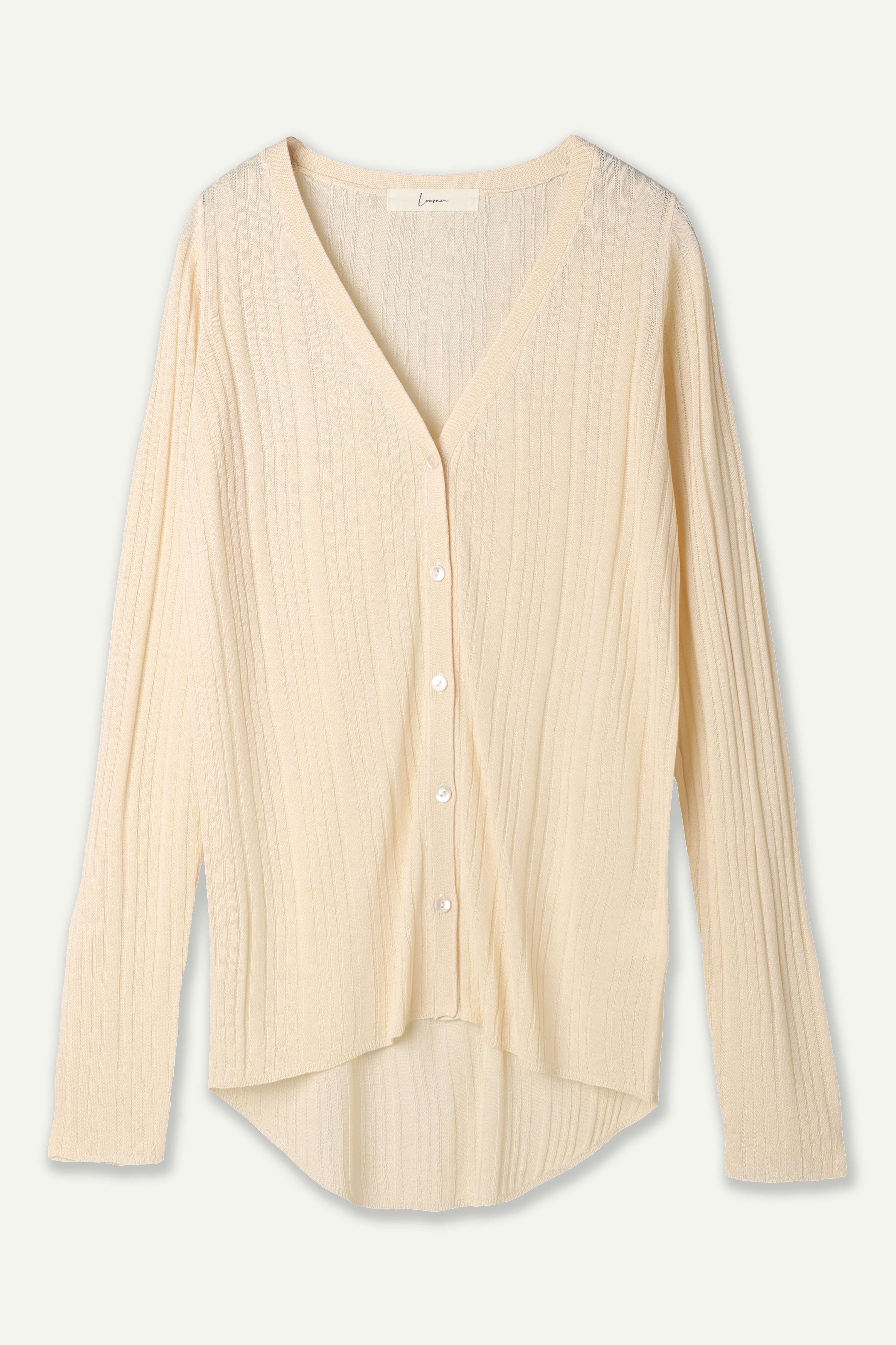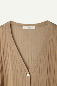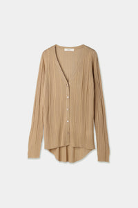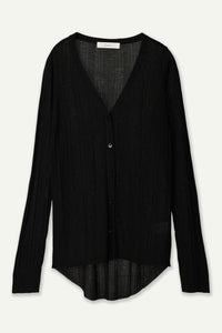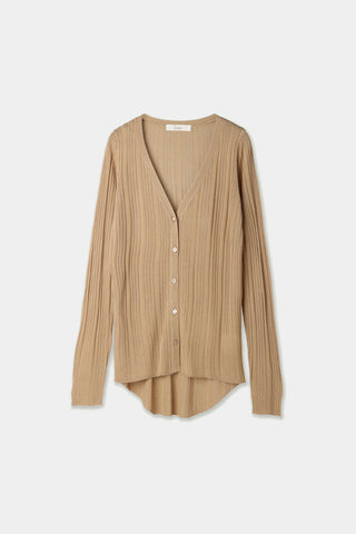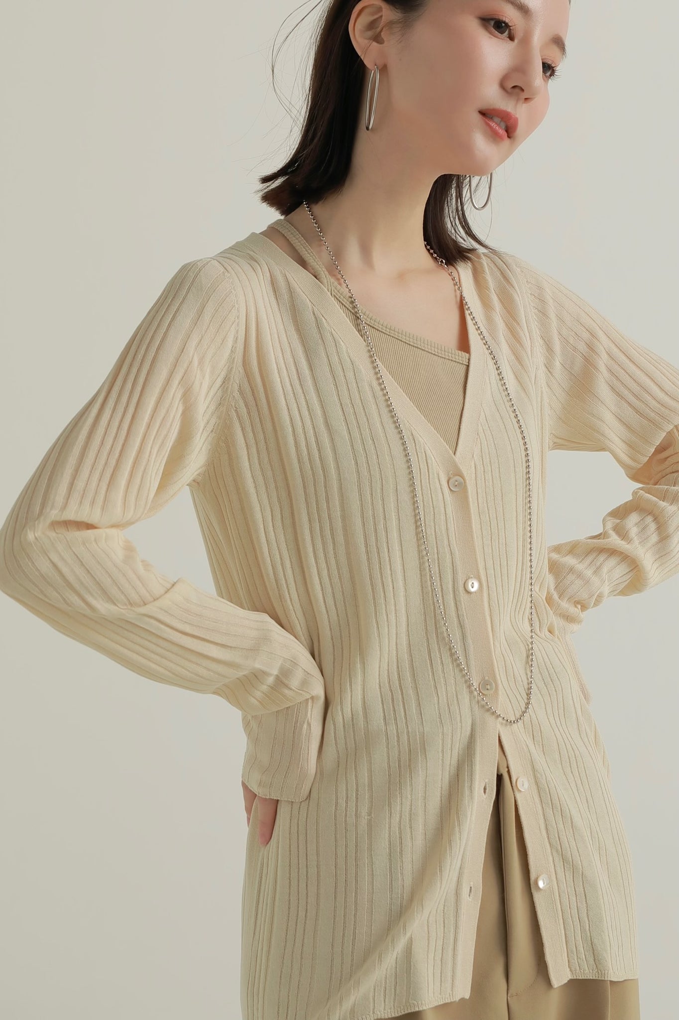 透け感のあるリブ素材でヘルシーな肌見せが叶うベーシックなニットカーディガン。